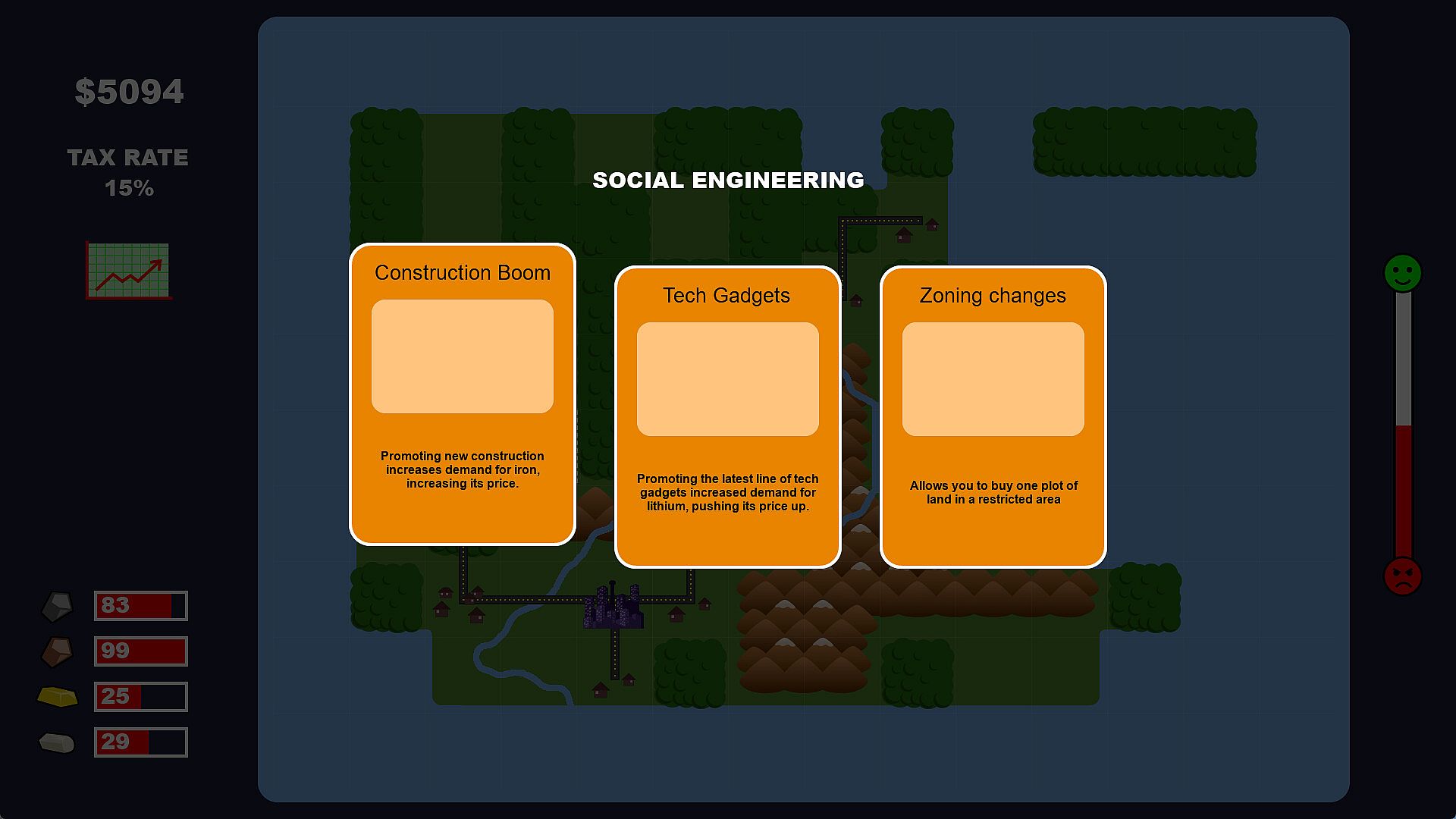 Control the economy: Sell now or store your minerals to wait for better prices. Influence the economy by bribing the government or simply by withholding those precious minerals.