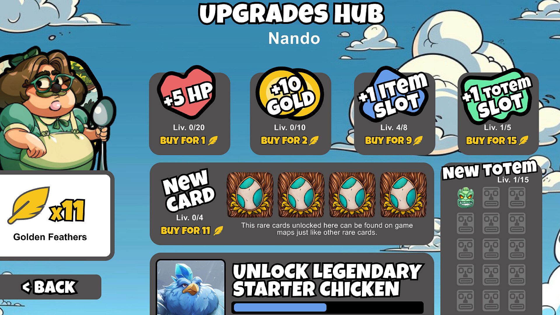 Earn golden feathers with each run to unlock new cards in the Upgrade Shop. Fail, adapt, and grow stronger. Keep going, gather Likes with your Henfluencer, and you’ll unlock their legendary card, a game-changer that can completely alter your strategy.