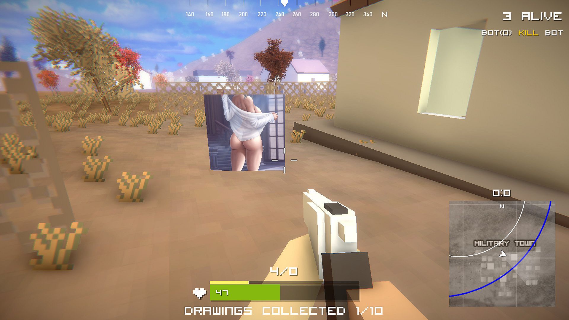 Megacraft Hentai Battlegrounds is a mega battle royale set in a hot desert. Your plane flies over the entire level. Choose the most convenient place and make a parachute jump. Once on the ground, look for weapons, equipment and everything that will help you survive. Remember, you have very little time, the battle is about to begin! There are many fighters in this desert, but by the end of the round, only one will be left alive. Take an advantageous position and wait for the enemies to come to you. Or vice versa, play aggressively, explore the area and try not to get into the deadly zone, because it is constantly expanding. You have two ways to win this game: The first is to be the coolest and just destroy all the enemies. The second is to carefully explore this huge desert and find ten stunning hentai drawings hidden somewhere here. Everything is in your hands!