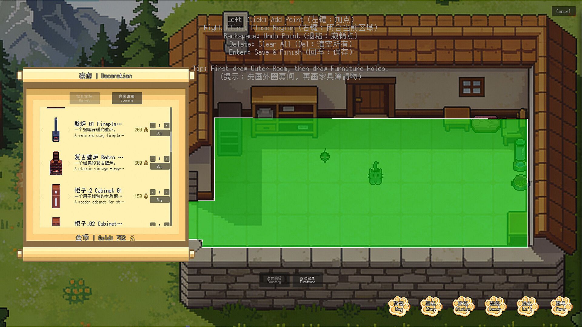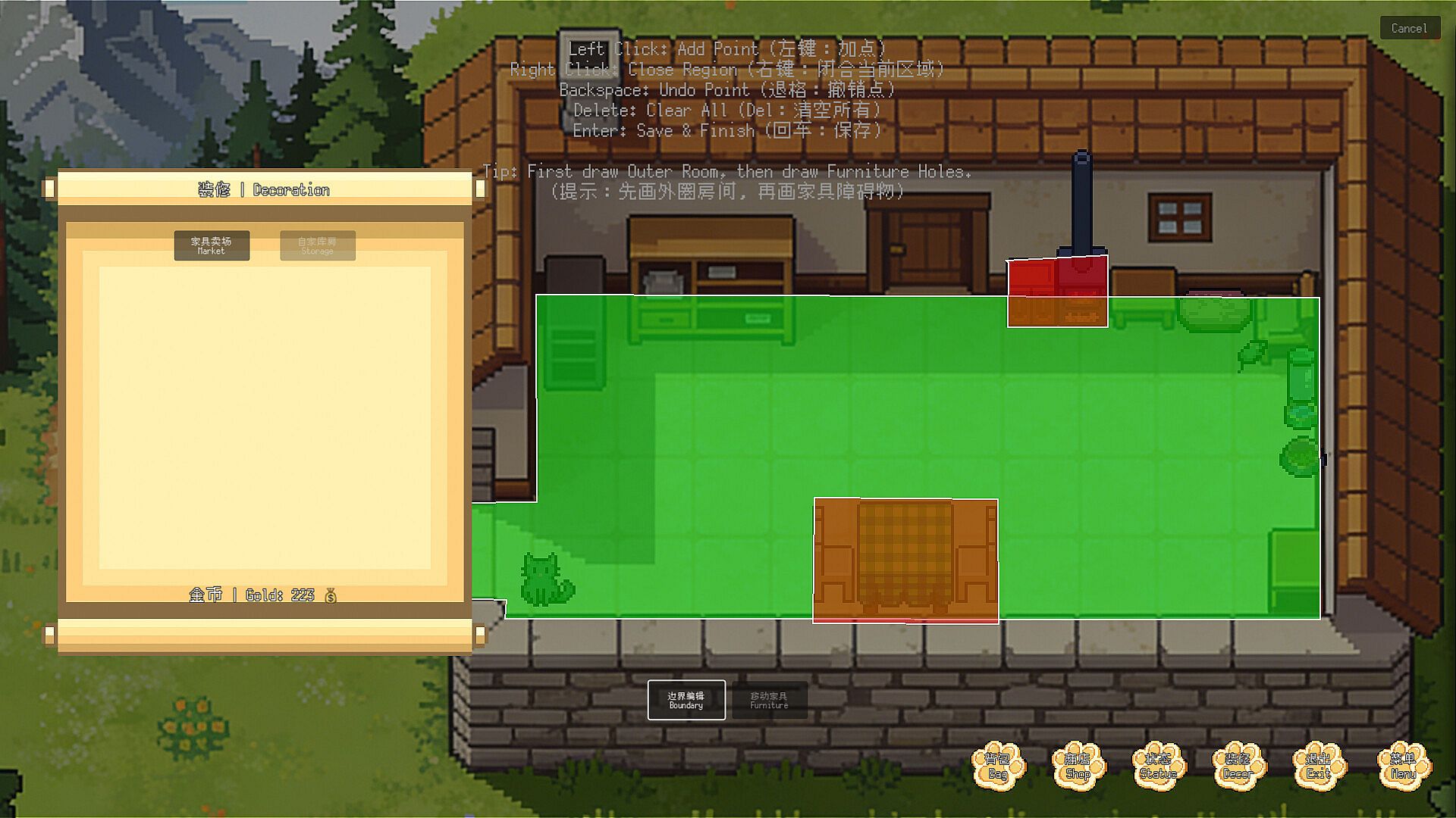 This game features desktop pass-through, so you can use any desktop wallpaper as your cat's home. To this end, I've added a cat activity area setting and a restricted zones feature. Combined with the in-game furniture placement system, you can design a more comfortable space for your cat. (Try not to leave small gaps, as the cat or its toys may get stuck inside. If this happens, simply drag them out with your mouse.)