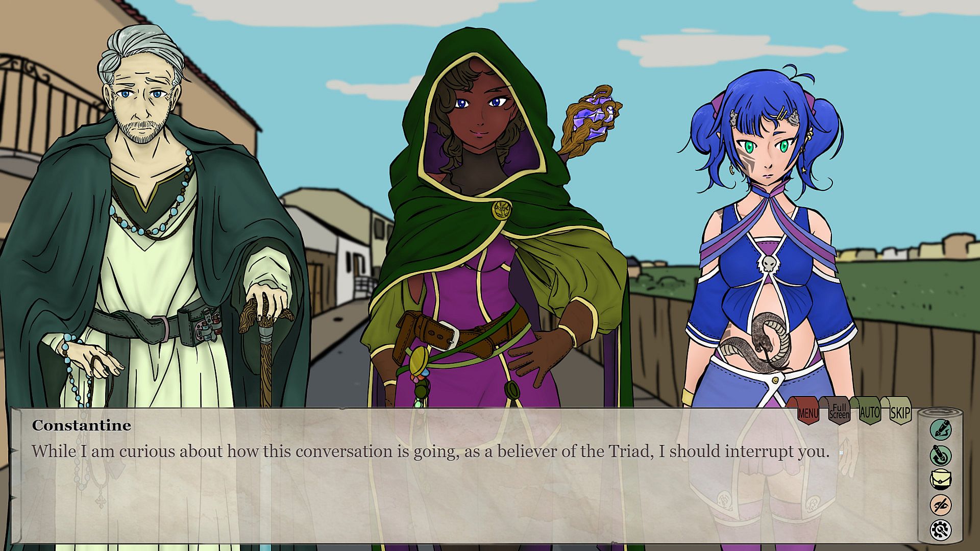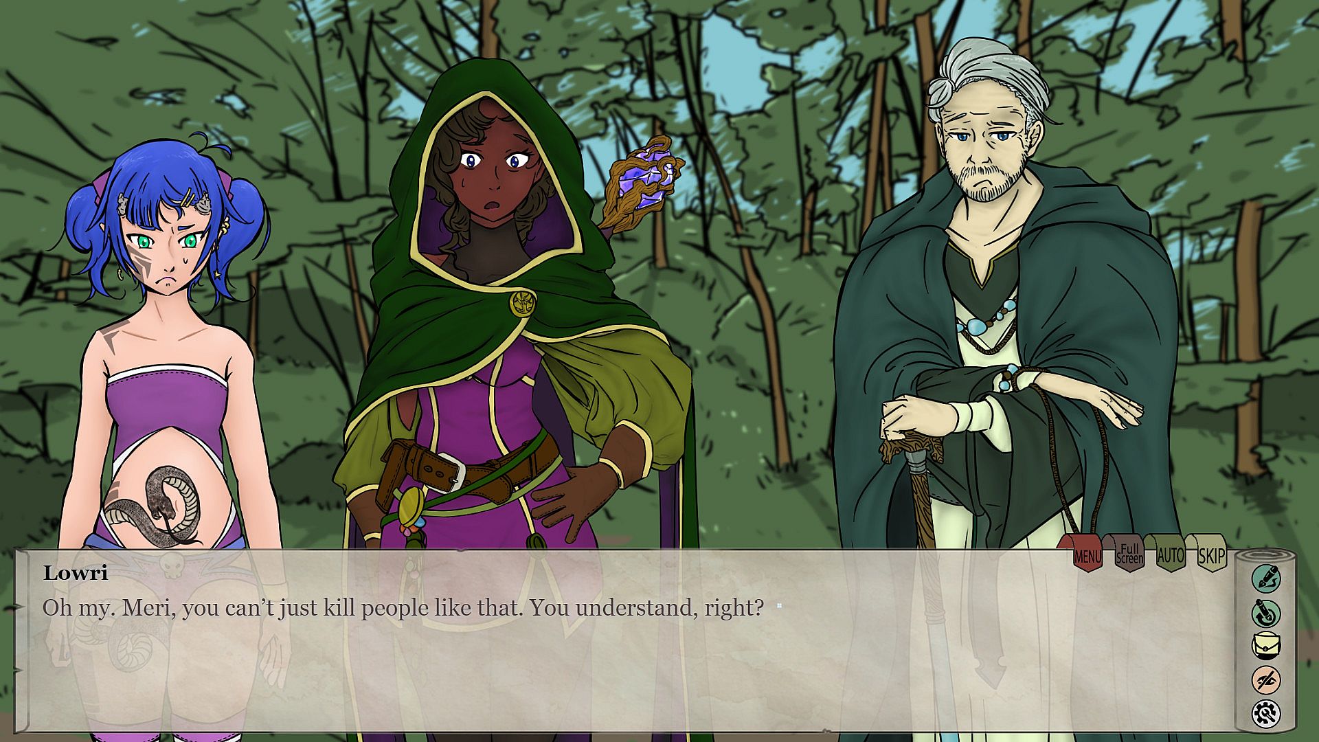 You will take on the role of Meridiana, a demon summoned to a high-fantasy world by a young witch. During your adventures, you will help your companions while getting to know them better. However, demons have a bad reputation for a reason: they easily succumb to madness and wreak havoc. Will your demonic nature take over, or will you learn from others how to be a good person?
