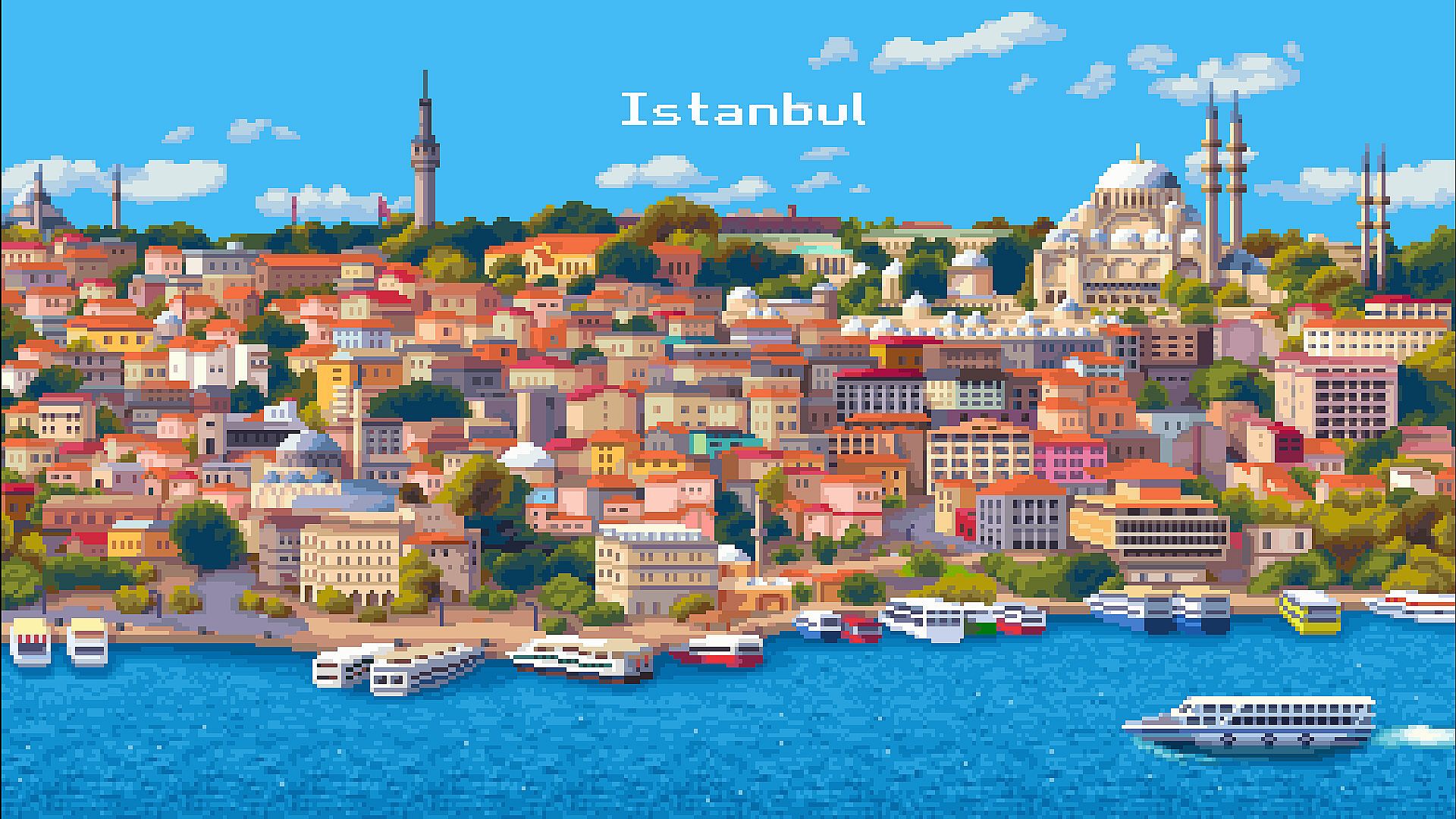 Detailed pixel-art environments based on real-world locations in Egypt, Turkey, and Vatican City during the 1970s.