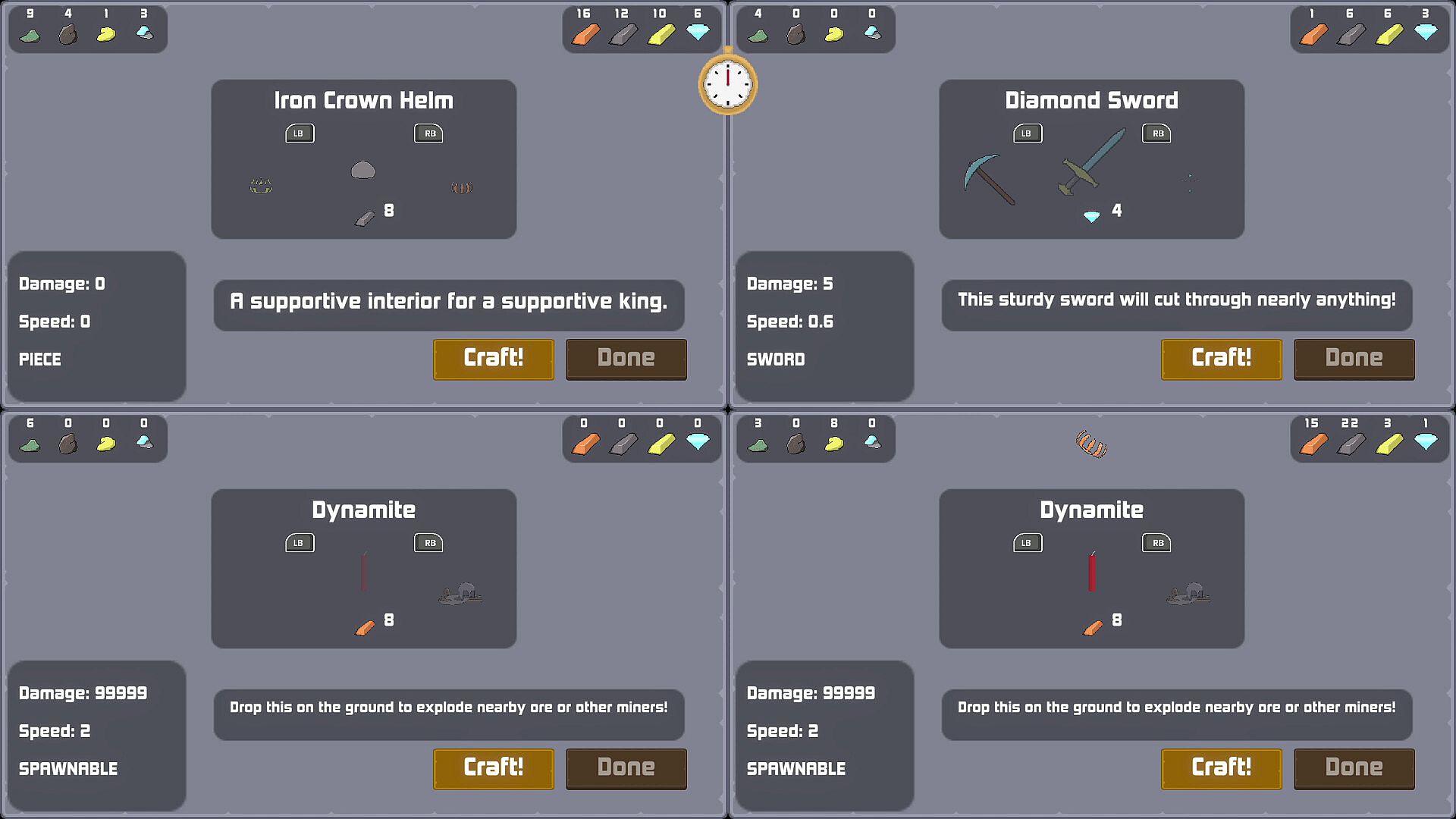 Metal Miners is a chaotic, resource gathering, party game set in a cave full of rich resources. In this 2-4 player, split-screen, action-driven game inspired by cult classic Kirby Air Ride, players are tasked with crafting the glorious Golden Crown to please a greedy king!