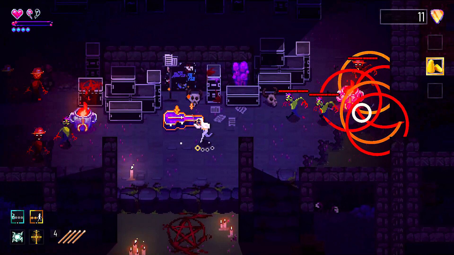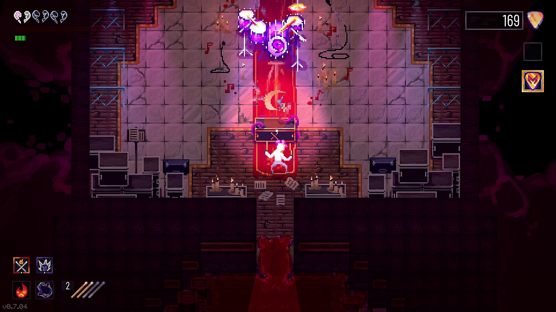 Your only companion in this hellscape is BingBong, a seemingly friendly voidling, who helps you along your quest by advancing your drumming skills… for a price. His booth at the end of each level is open to trade in guitar picks for something a bit more useful on a run or to put some pep back into your step.