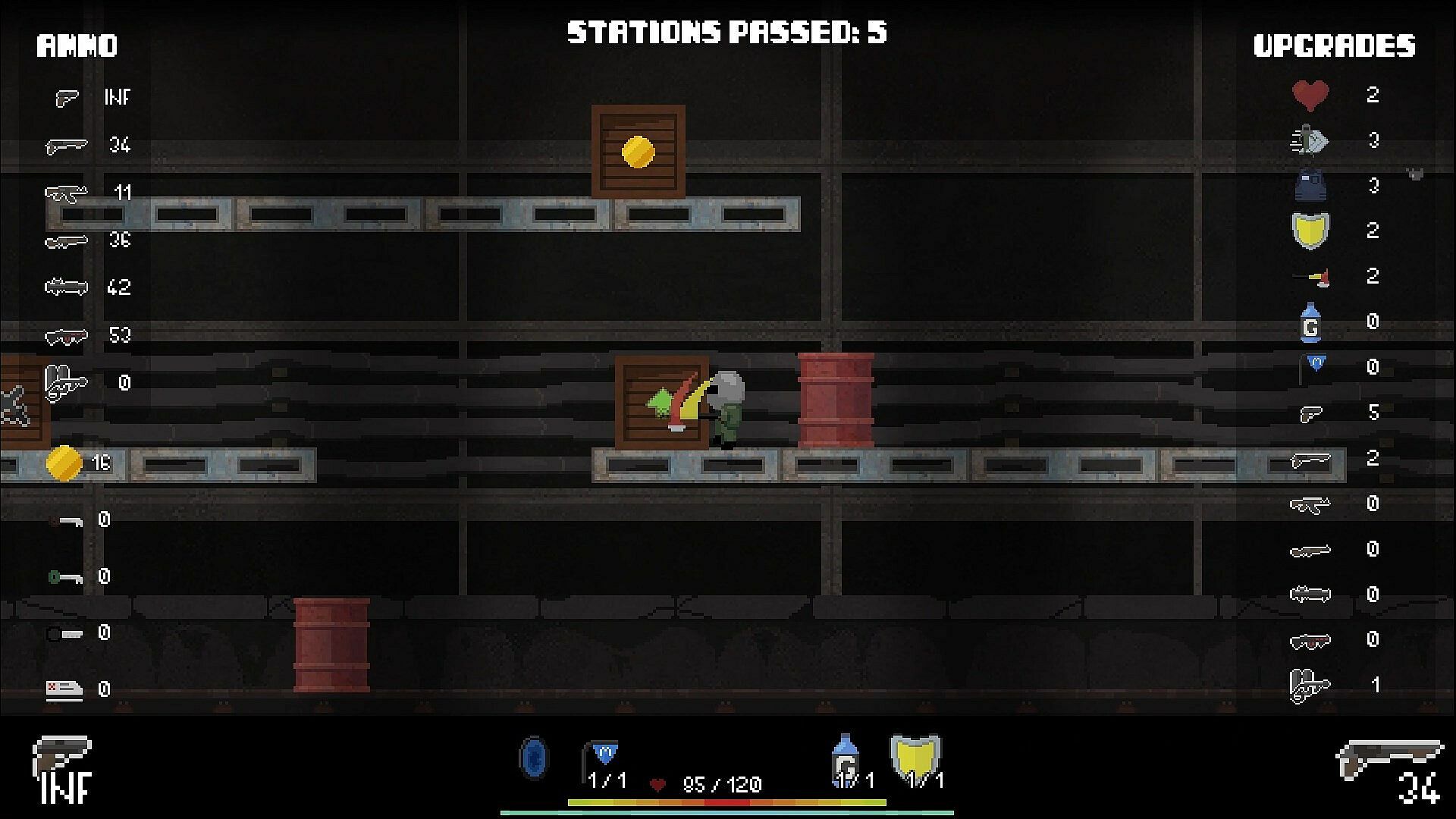 Reach the furthest stations in the postapocalyptic top down shooter and platformer looter. Loot tunnels in side scrolling mode and survive from waves of monsters on the stations in a top down twin stick shooter mode.