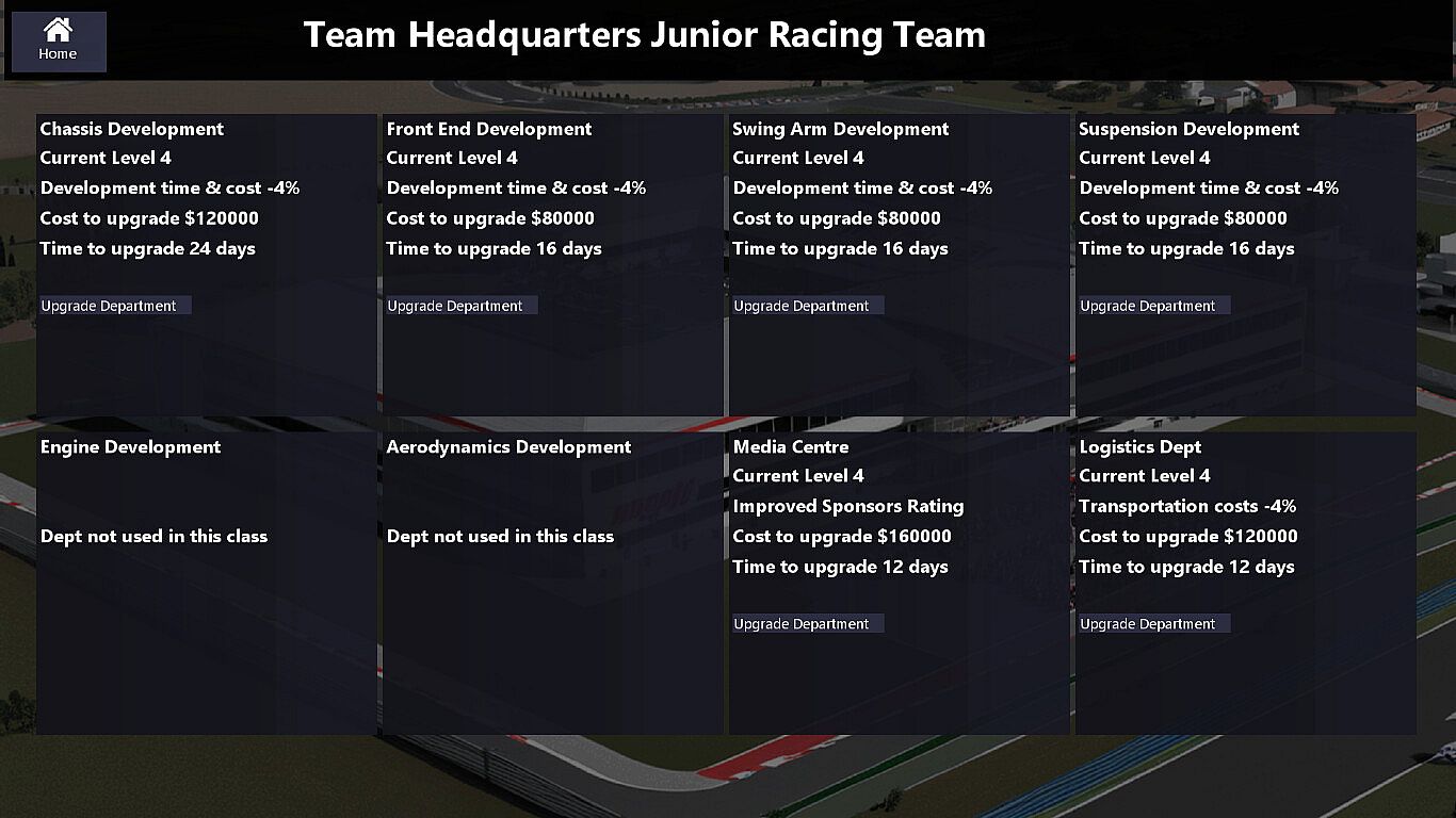 > Influence machine development during the current season and also for the following season, choose from specific areas of the machine to improve and choose a long term upgrade goal to help your team perform better.