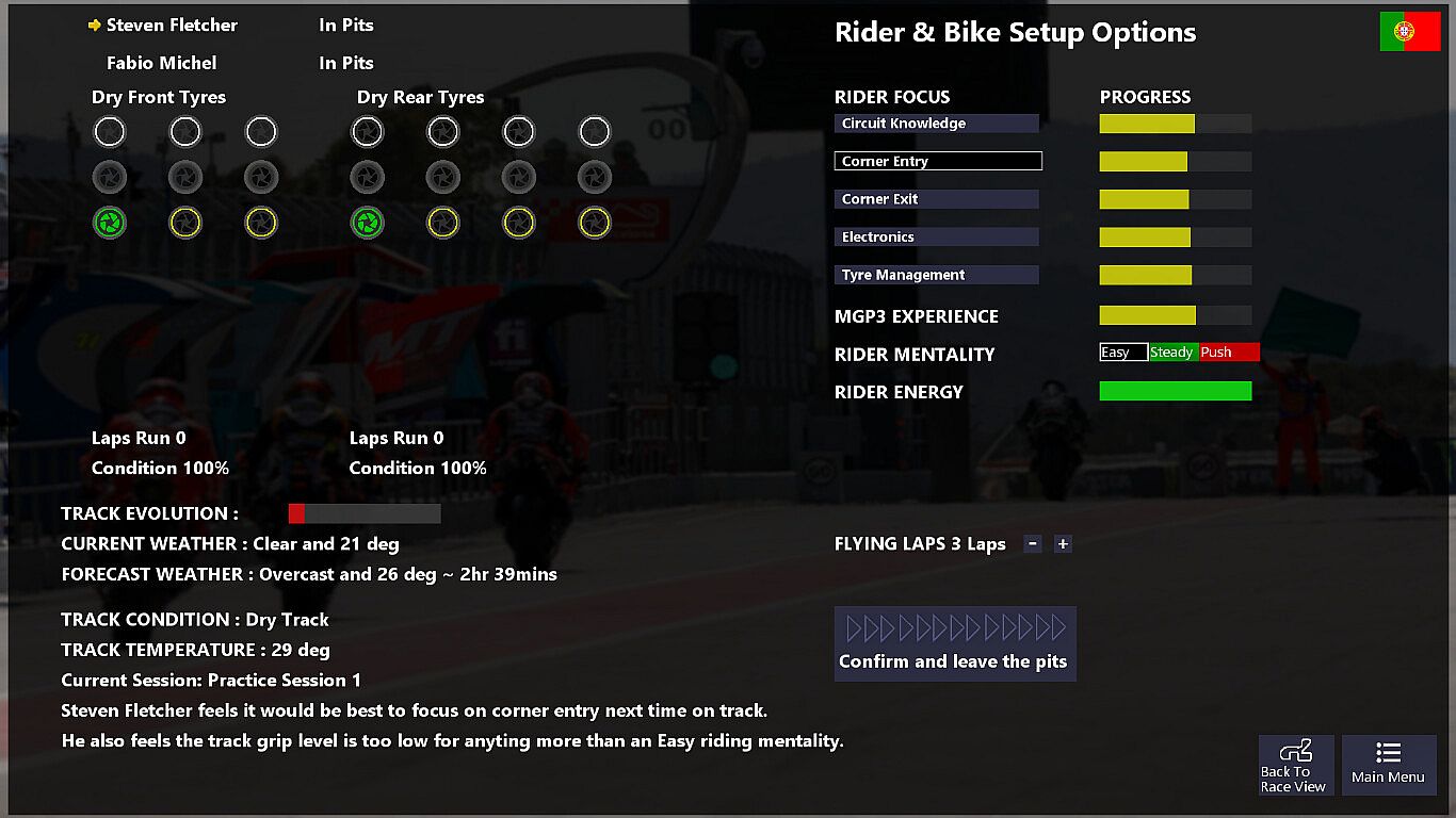 > Track Evolution - at the start of an event, the circuit will need time to 'rubber in' to allow riders to set their best times. Rain reduces circuit grip even after the track has dried so this needs to be monitored to ensure your riders are on track at the right time.