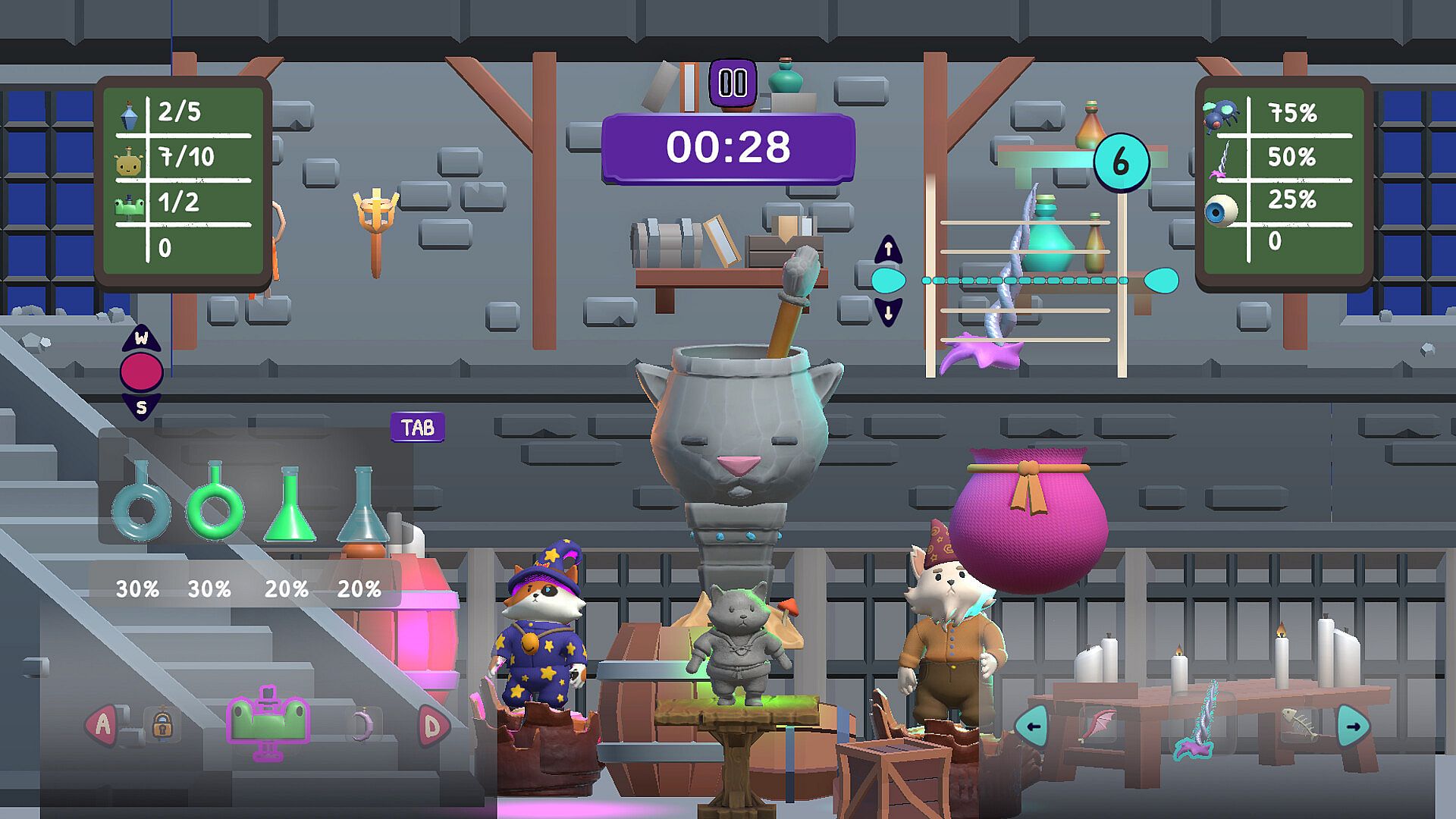 Miautemágica is a cooperative game where math and teamwork blend into a cute and challenging adventure. Play with a friend and discover together how to use fractions and percentages to create the potions that will save the Whisker Kingdom!