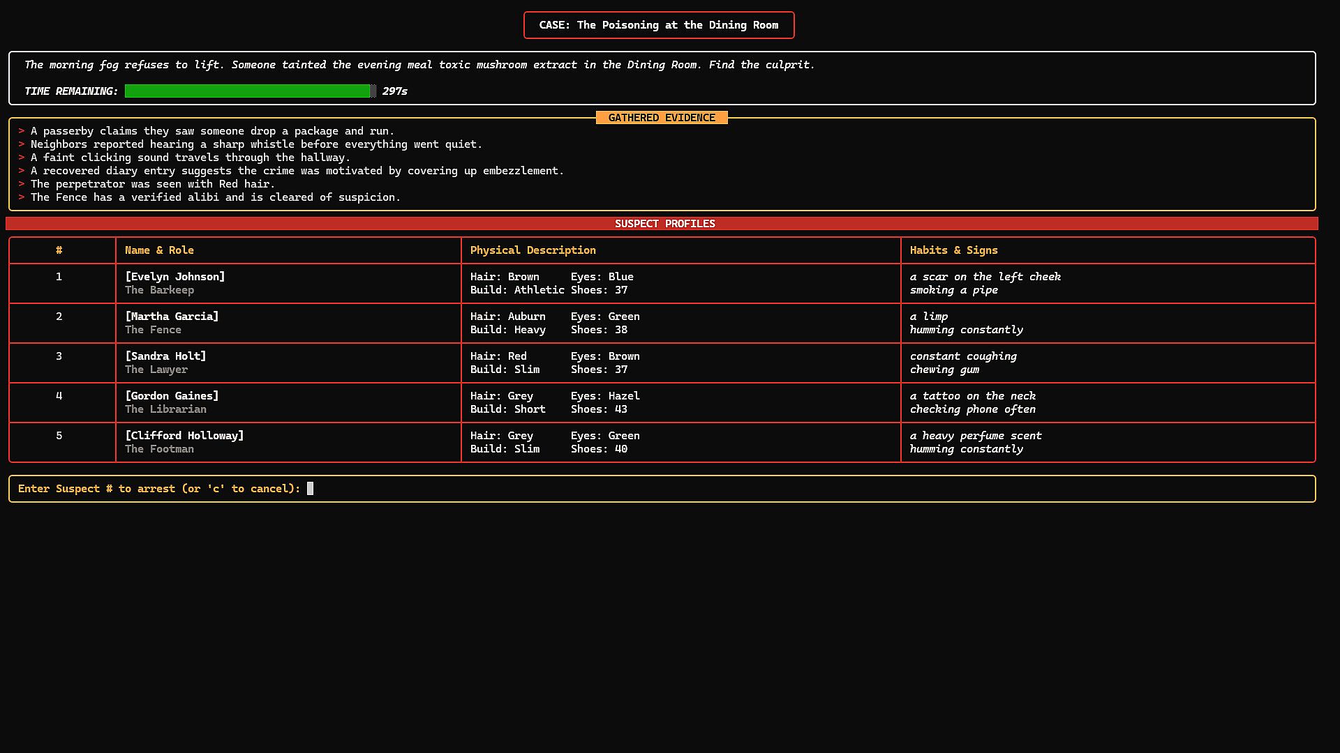 • ANALYZE: Read the generated clues. "The perpetrator was seen with red hair.", "A footprint of size 42 was found in the mud."