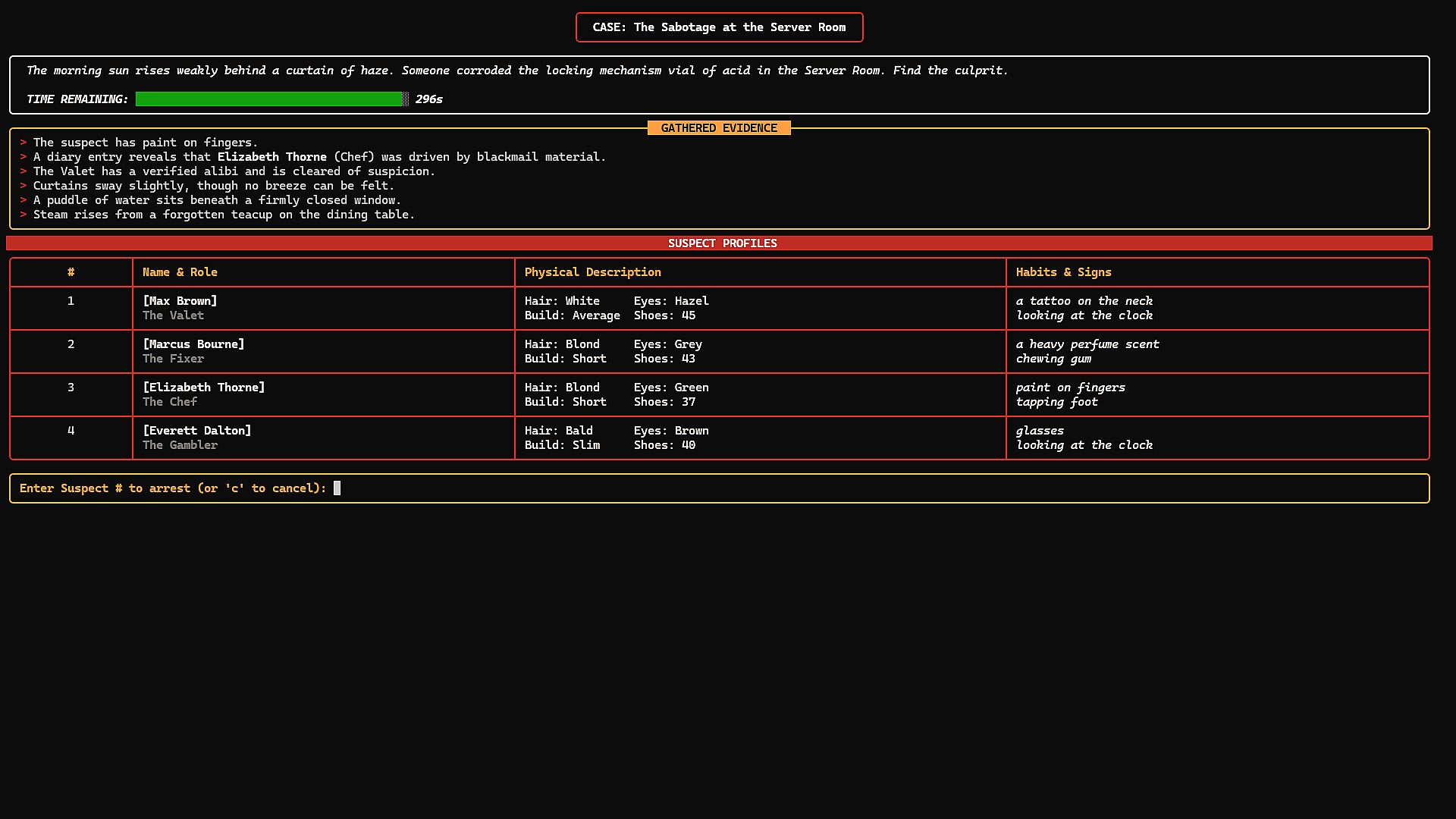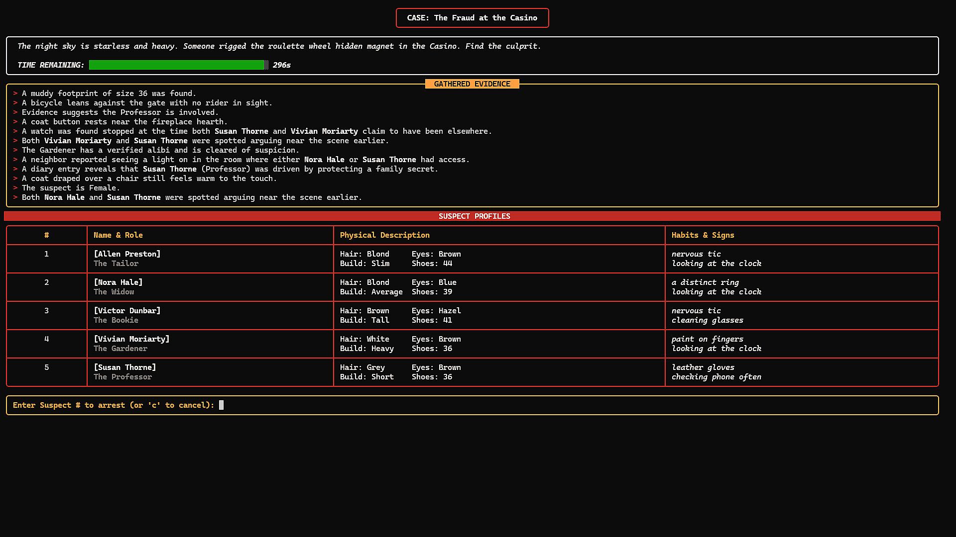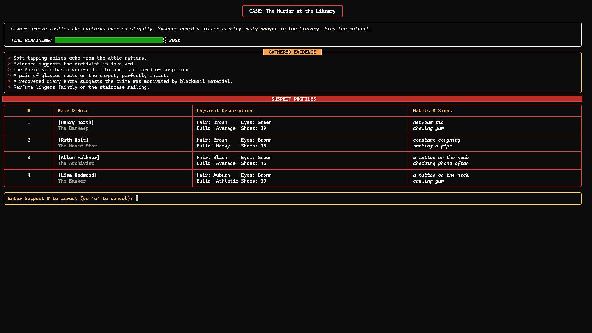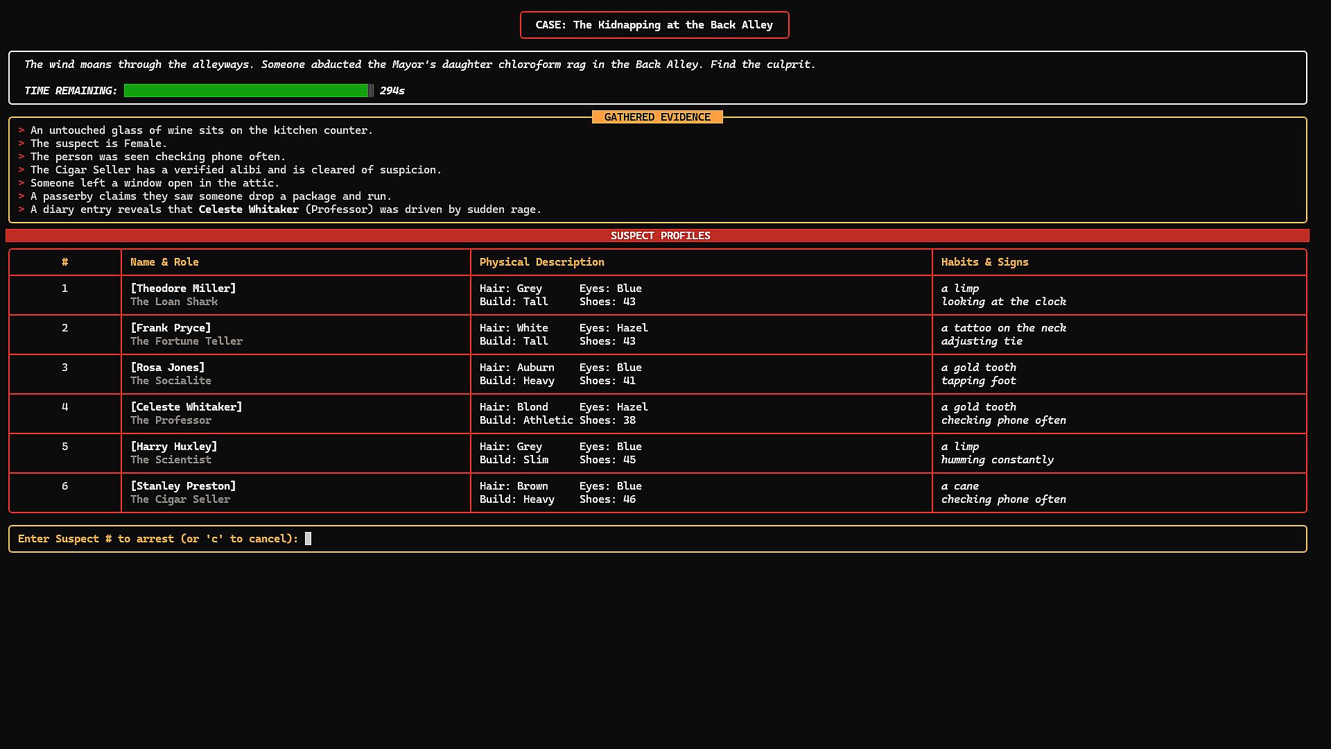 • 🕯️ Atmospheric Noir Style: An immersive text-based interface with a retro color palette and dynamic weather descriptions, designed to evoke the mood of a detective’s personal terminal.