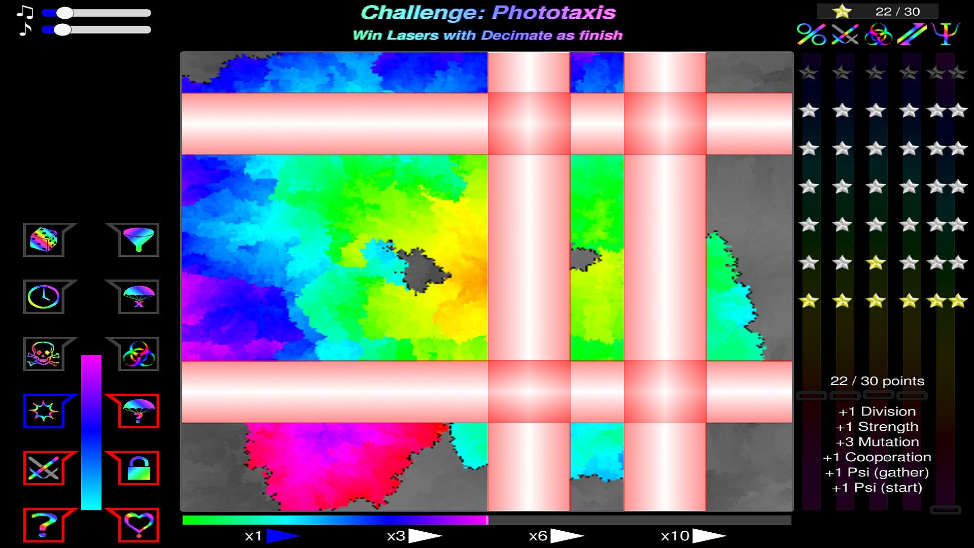 • Control your mutation tendencies: Prioritize between speed of reproduction, combat power, mutation rate, cooperation, and psychic strength. Everything is important - but the right ratio depends on the situation.