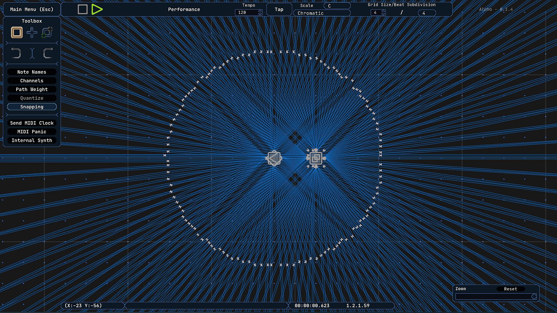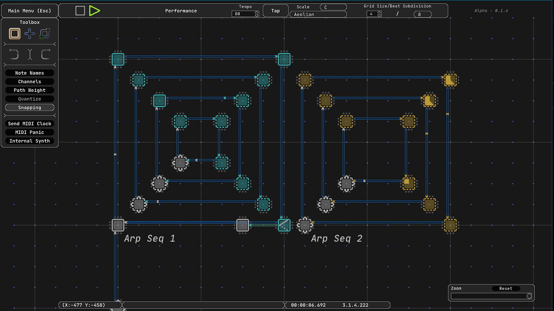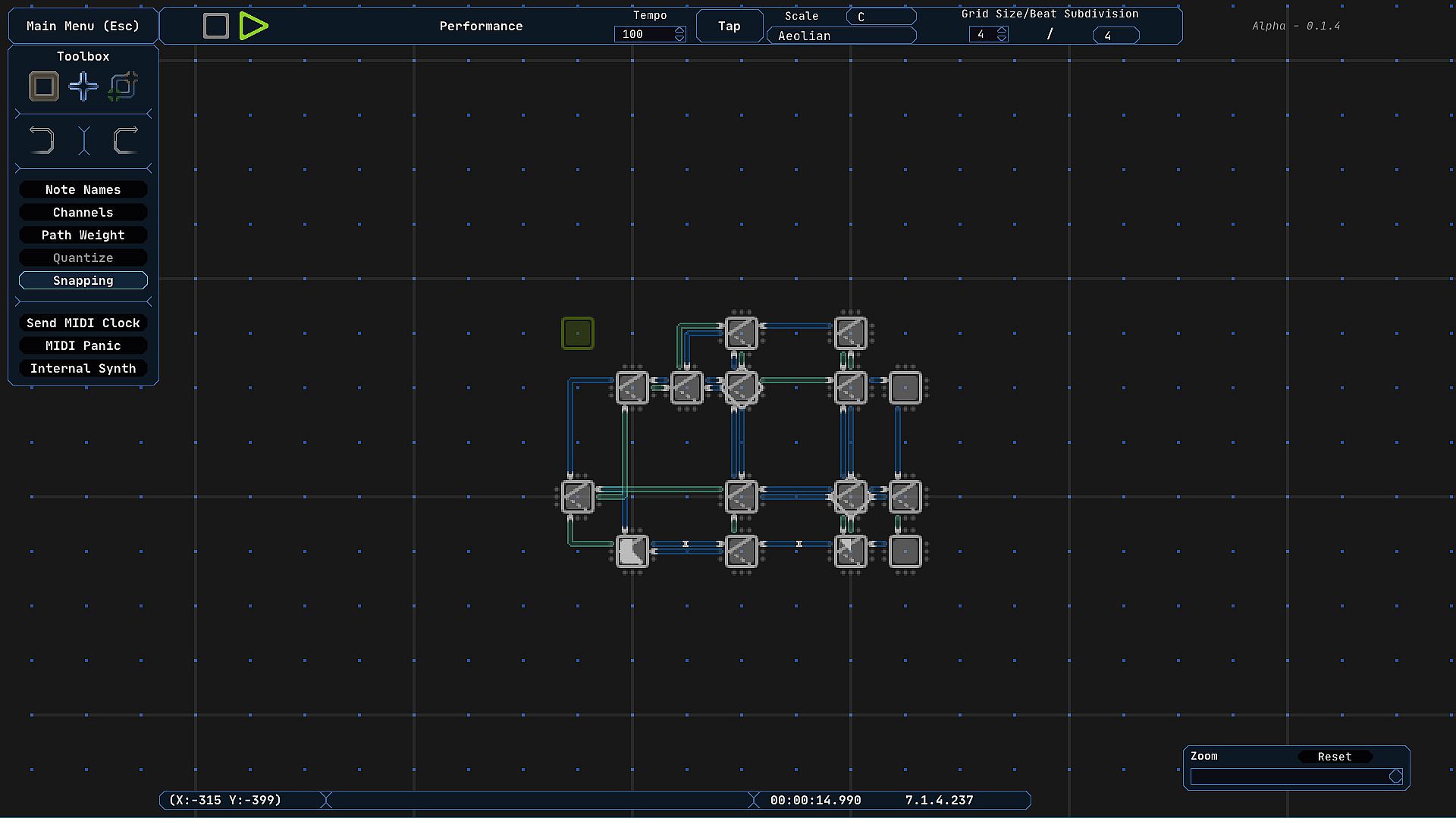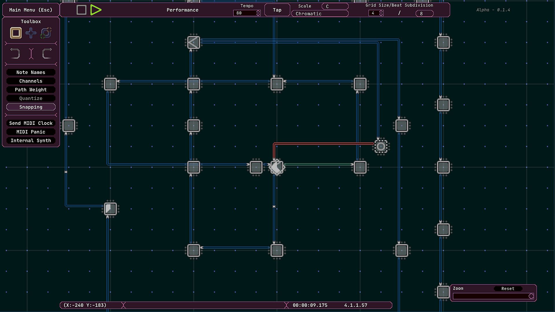 Midinous works on a grid system where the distance between each tile is a quarter note. Arrange objects called ‘Points’ and connect them together with ‘Paths’ to quickly create complex looping or branching sequences of MIDI data. Branch to points randomly or instantly, split signals, or have signals travel in order of Path creation. Turn snapping mode off for complex rhythms and odd timing!