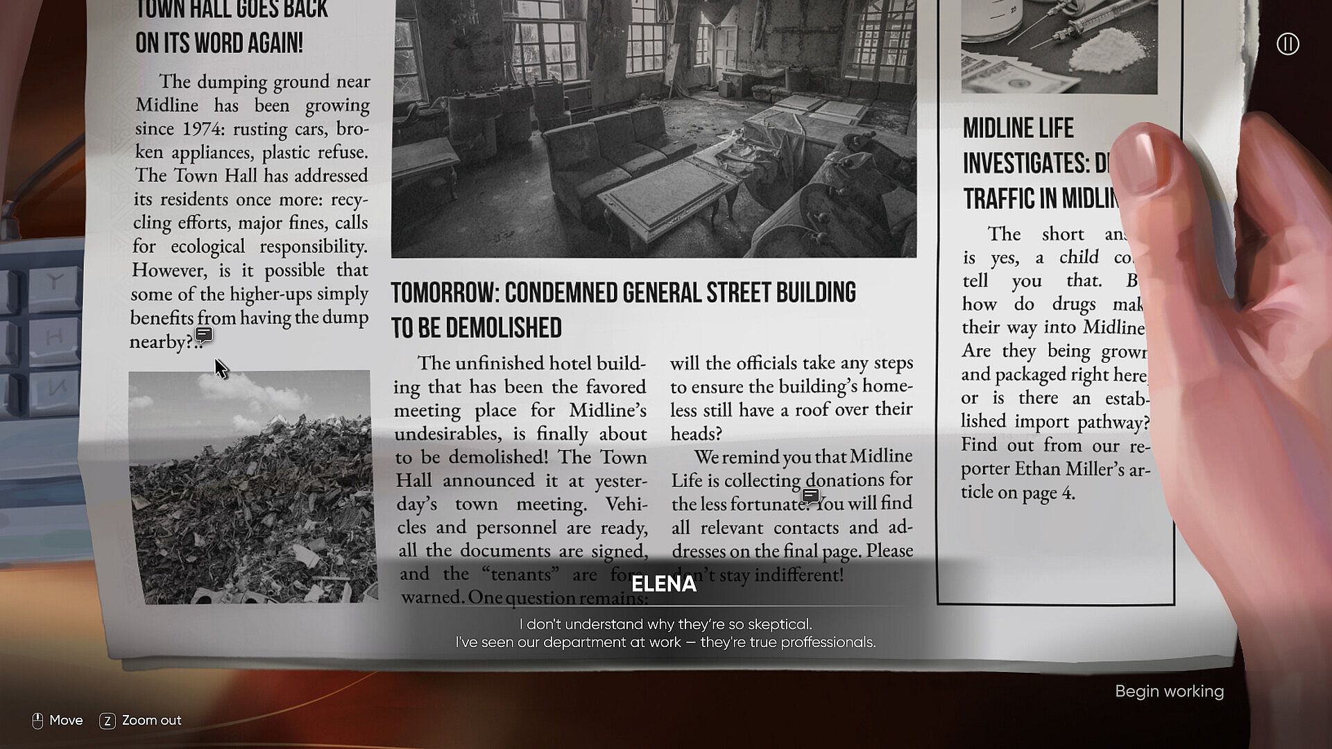 Study Midline for the smallest details of its life: local radio broadcasts, the morning paper, or work mail. Find information that will unlock new dialogue options. But remember: there is no knowing where an unexplored path might take you…