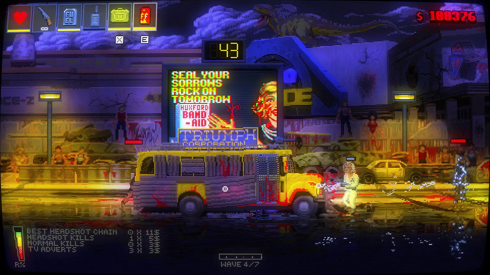 Zombie Bus: When there aren’t enough zombies on the screen at a certain difficulty level, Mr. Triumph’s gift(!), the Zombie Bus, arrives and drops zombies at certain points. This increases your ratings but makes your job a bit harder.