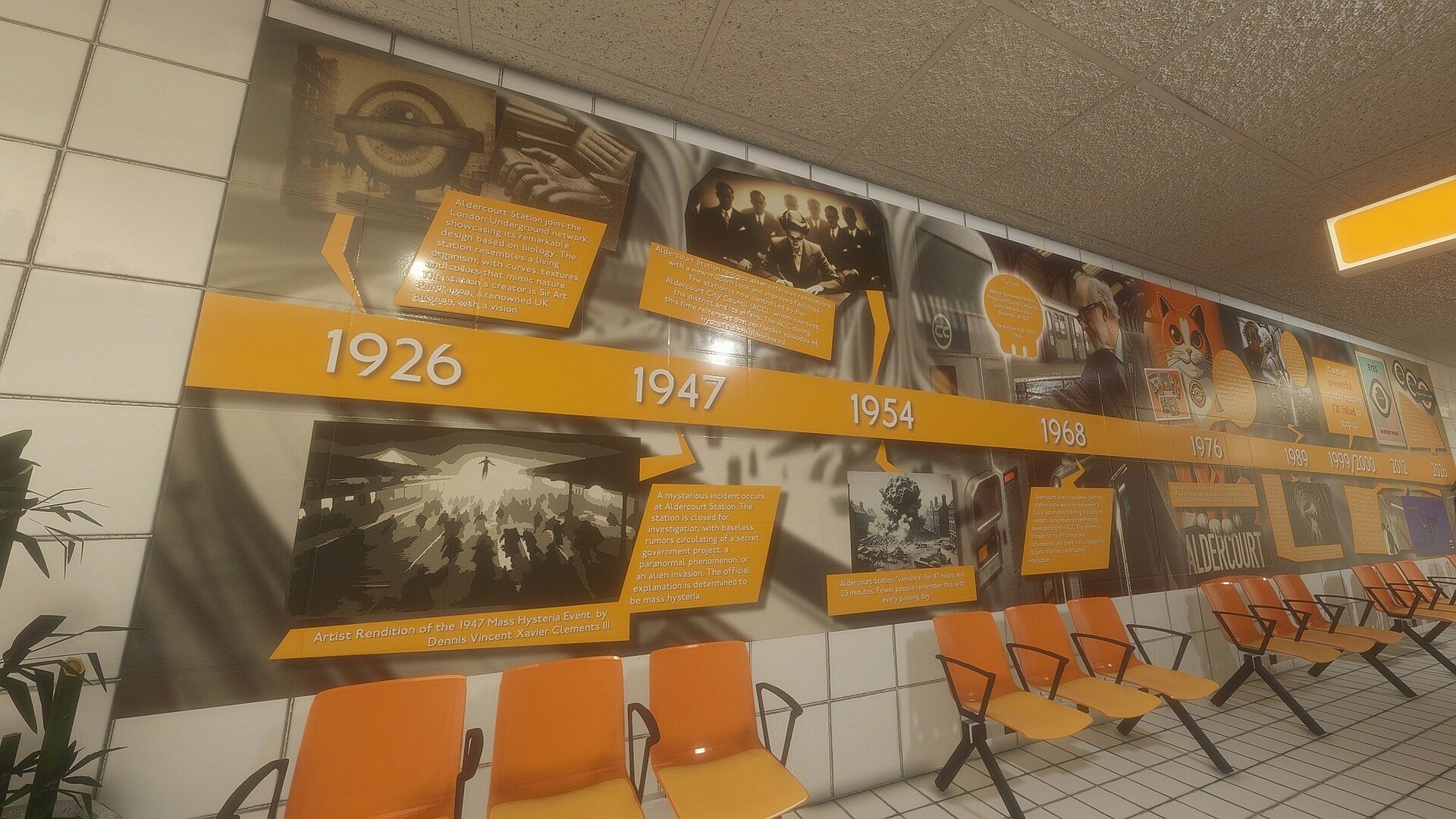 Aldercourt Station is a sprawling and expansive addition to London's Travel Network. Come get lost amonst its tile halls and take in the scenery as you pass through its liminal spaces.