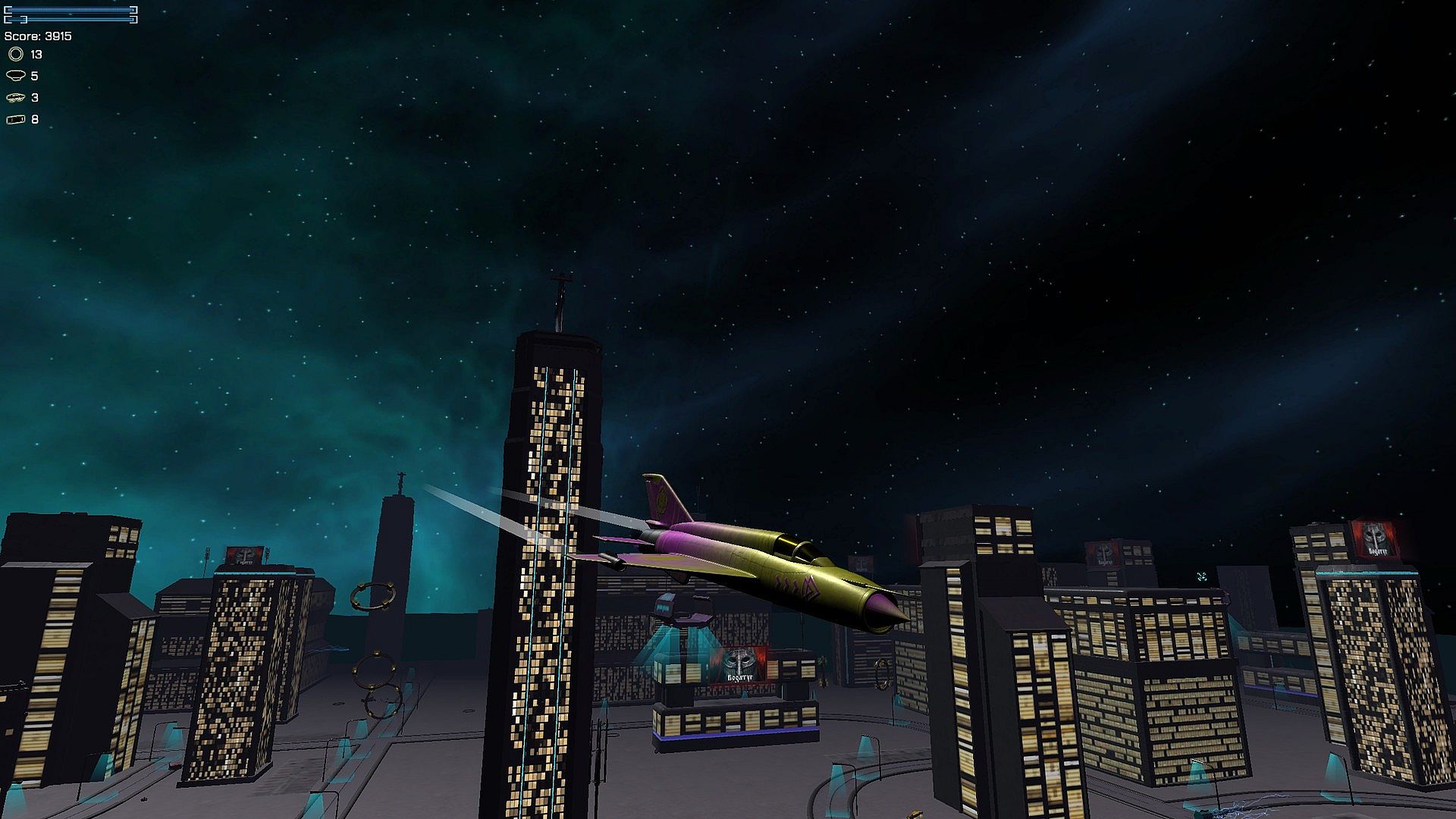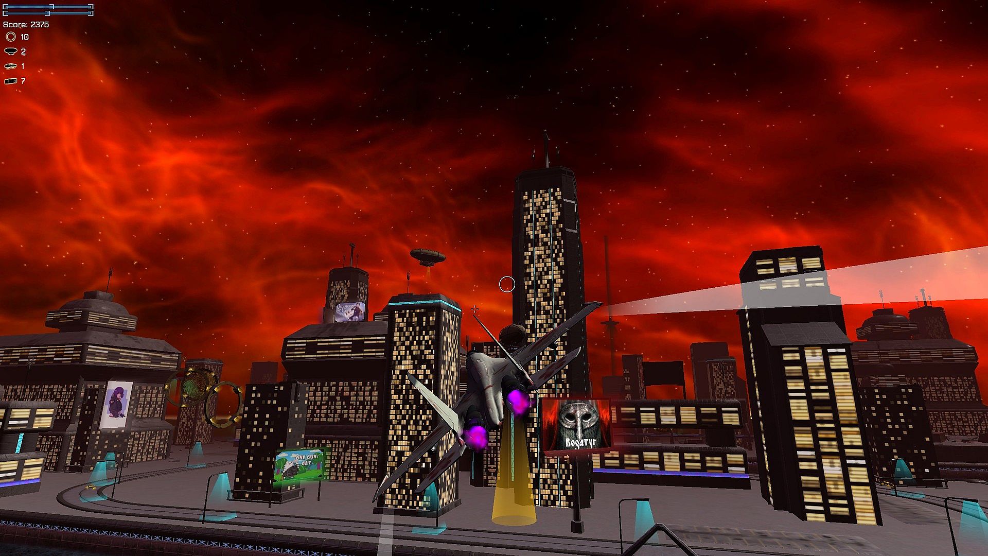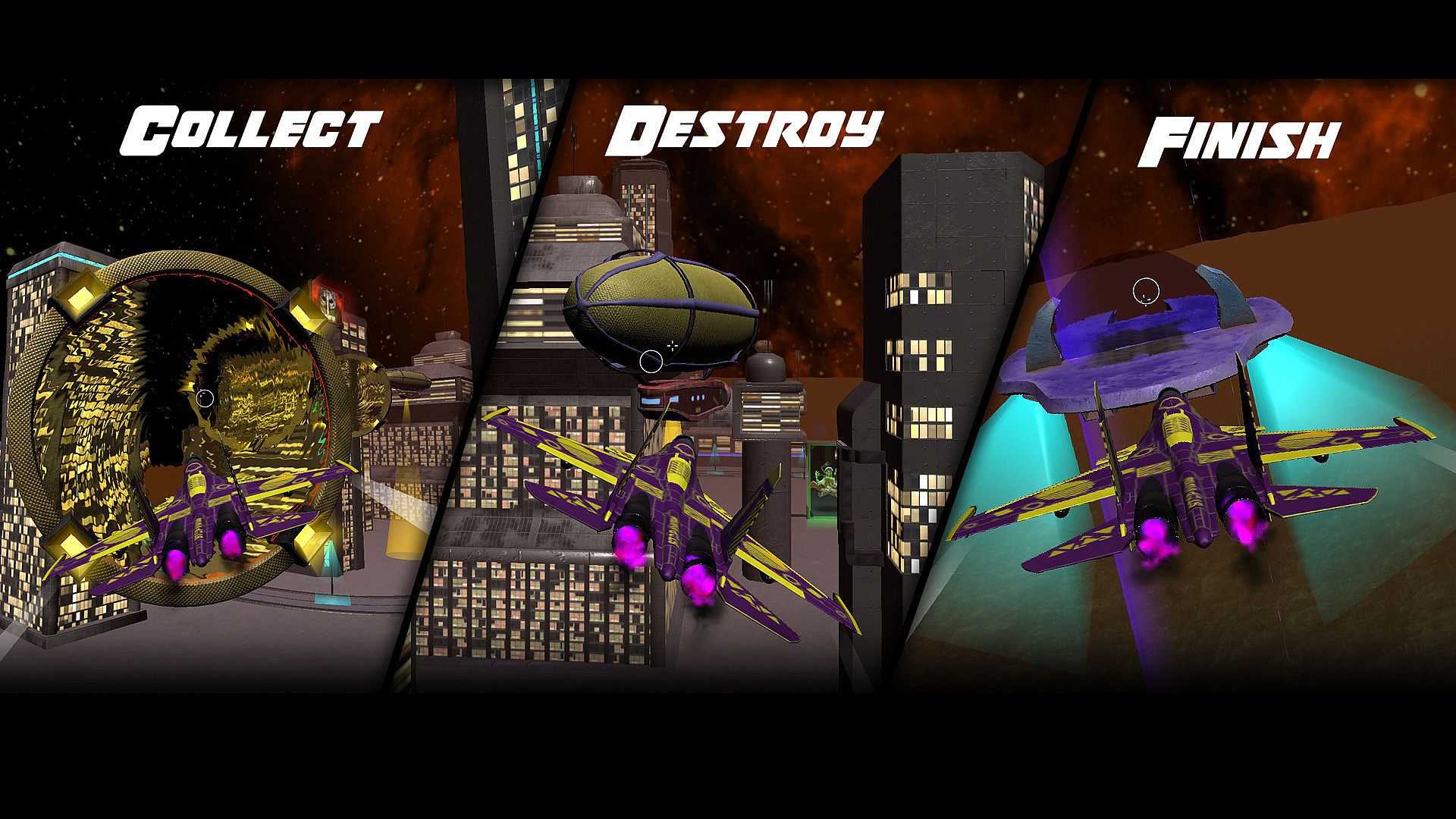 This time, players will fly the most fashionable fighter jets around the night city and shoot down the enemy's barrage airships, gaining extra points by flying through stylish levitating rings. And all this under the most powerful post-punk.