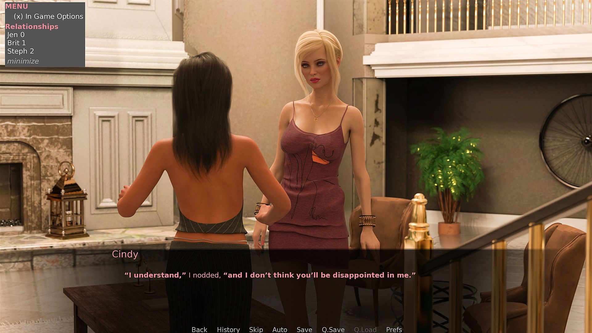 Relationships that can be randomized or fully controlled by you adds even more depth to the game. (In the code there is a random element that makes the choice for you, in order to keep the game uninterrupted. You can take full control by enabling from the game menu the option: random relationships and turn off relationship randomizer - to make your own choice. Some elements are kept fully random, like 1 of 3 clothes for the part where Cindy visits SOFI or when audio is random: Kevin's voice has a total of 7 tones (same content), Kara's voice has 2 tones (same content), etc. - a close and open of the game is needed for the new initialization of the random variables.)
