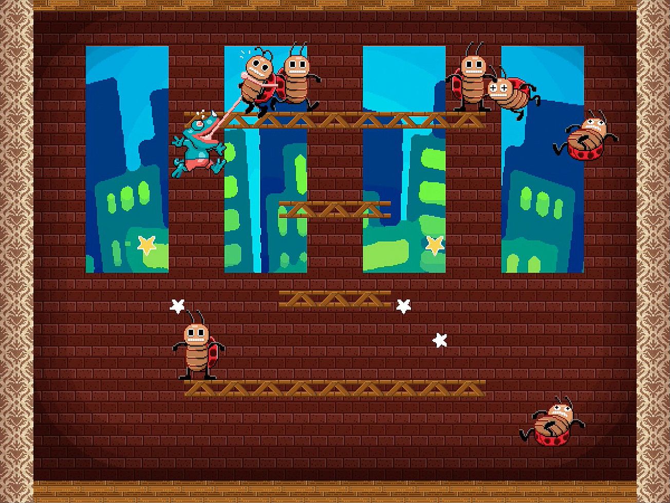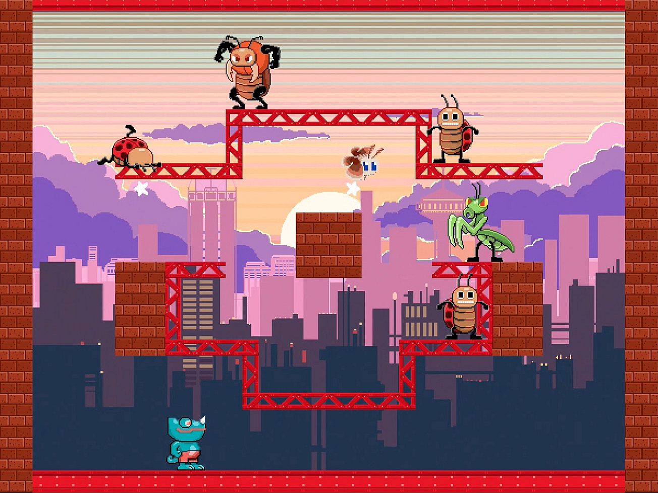Clear enemy insects from stages as fast as you can in this indie action game on PC. Control Lash, a lovable chameleon who grabs and defeats foes with his extendable tongue. Use arrow keys to move and aim, X or Ctrl to shoot the tongue, and Z or Alt to jump, all while chasing quick clears in arcade-inspired challenges. Bright, colorful visuals and cartoon characters echo 80's and 90's arcade classics. Simple controls deliver addictive casual play in a short session. Fans of old-school efficiency runs will enjoy the focused pace.