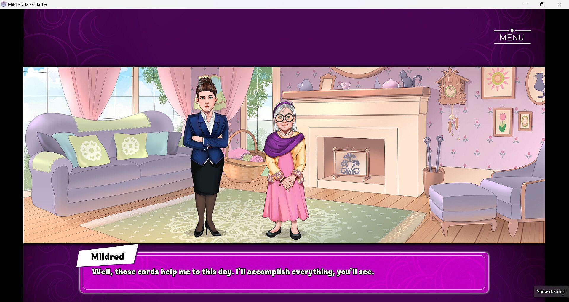Mildred's proving to her daughter that she’s not ready for the Old Folks Home. Join her in different adventures as she battles her way to independence with the help of her trusty Tarot Deck!