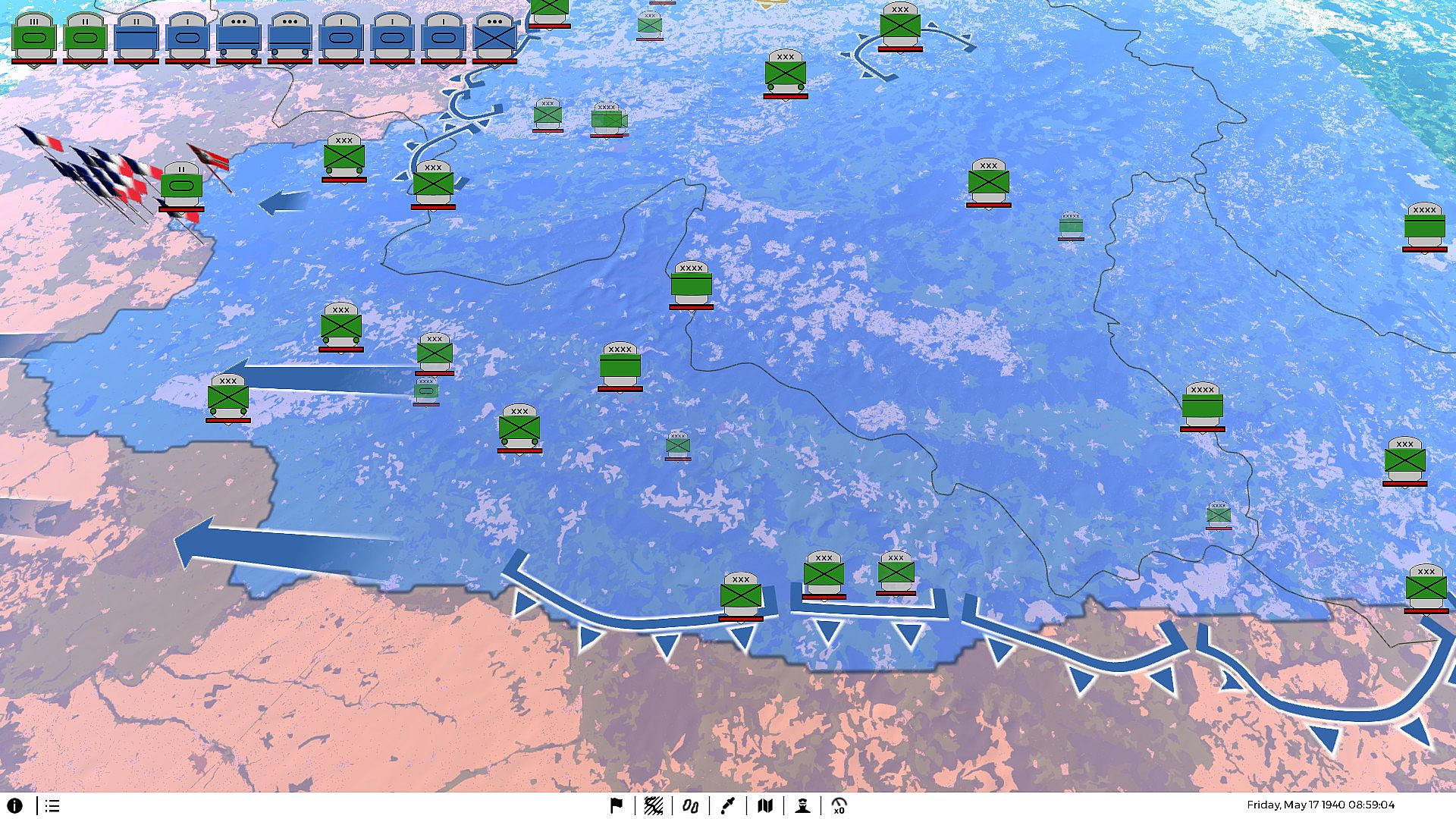 The game "Military Operations" (currently in development), is an operational level real-time strategy game set in World War 2 where the player assumes command of large bodies of troops and directs them to victory. Draw battle plans on accurate maps and watch your troops execute them to achieve your objectives. Adapt plans as the situation changes due to enemy action, unexpected changes in the supply situation or to improve your lines of communication.