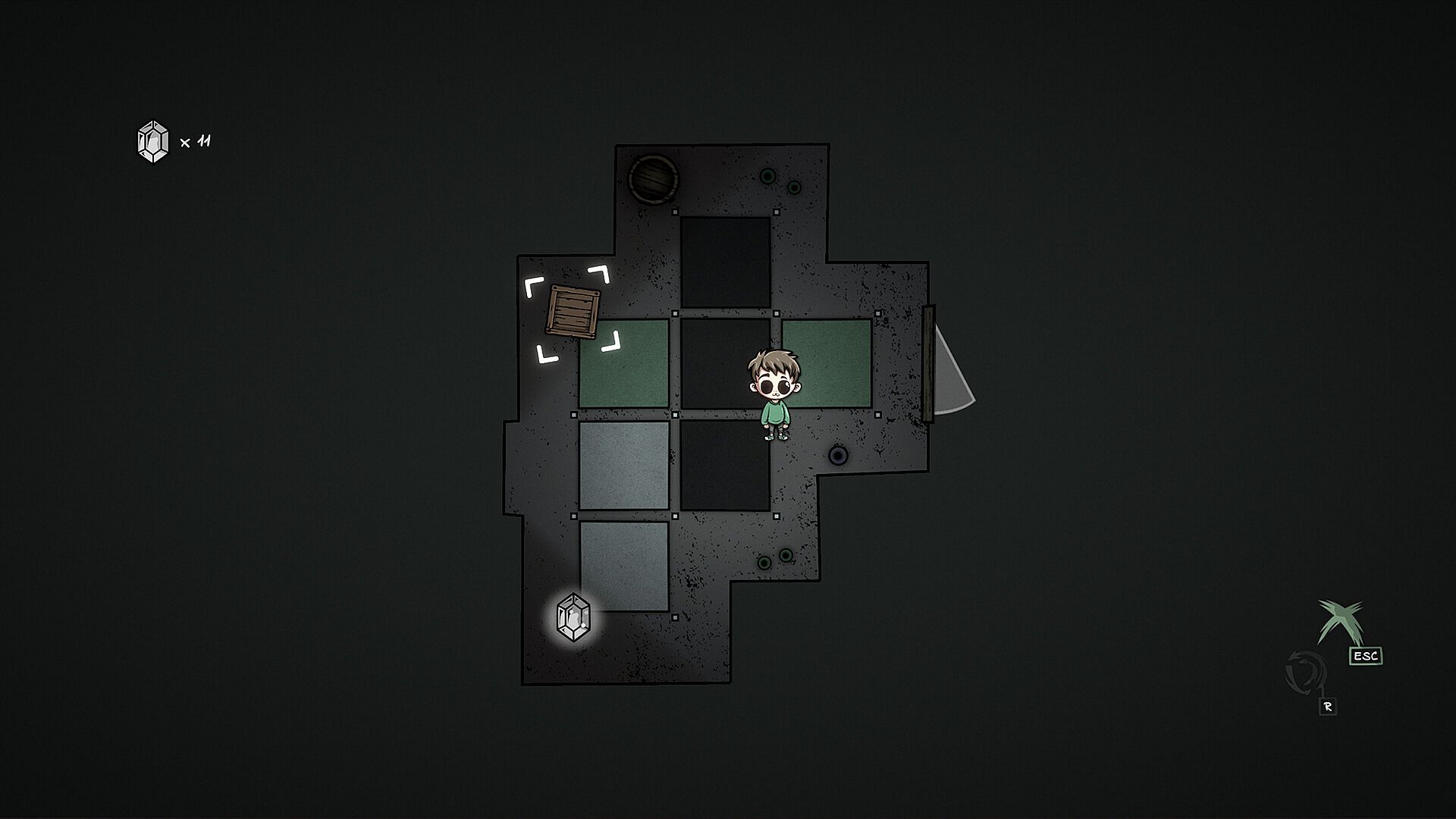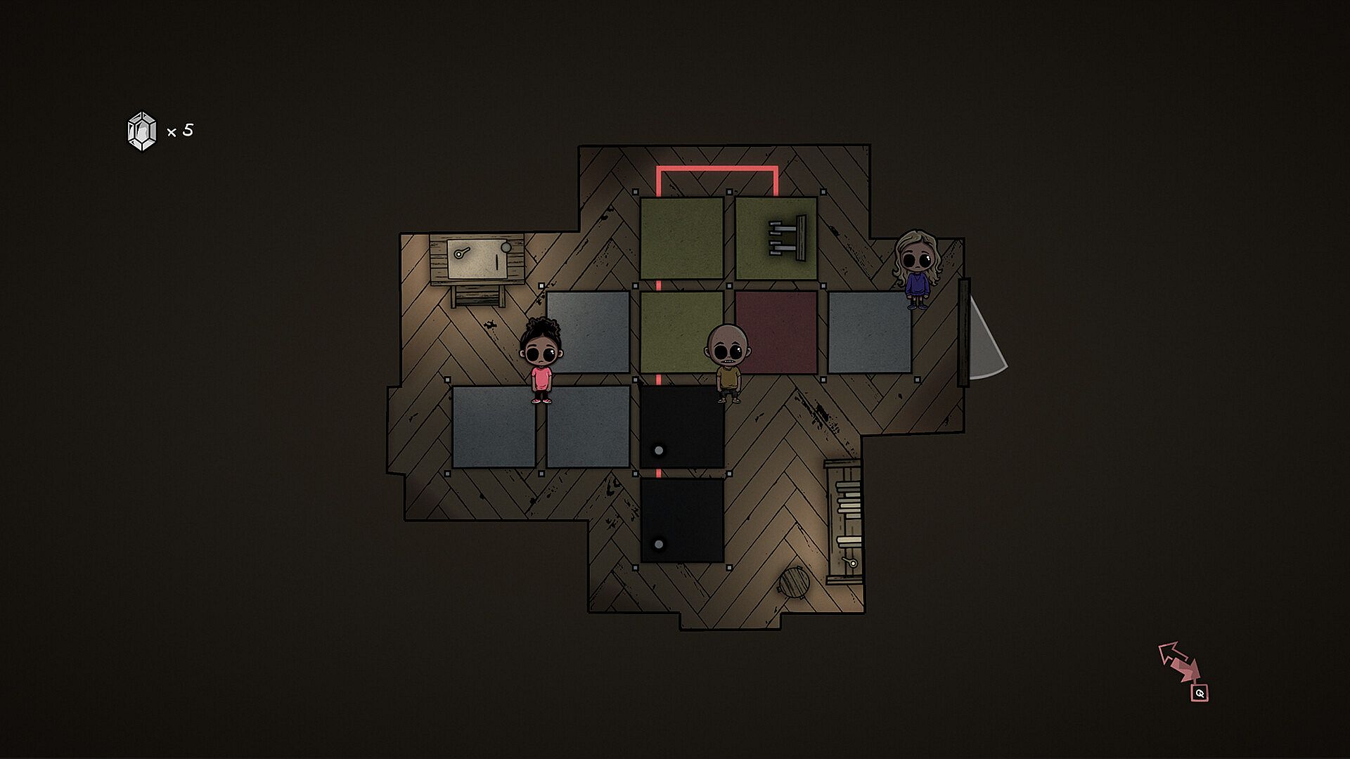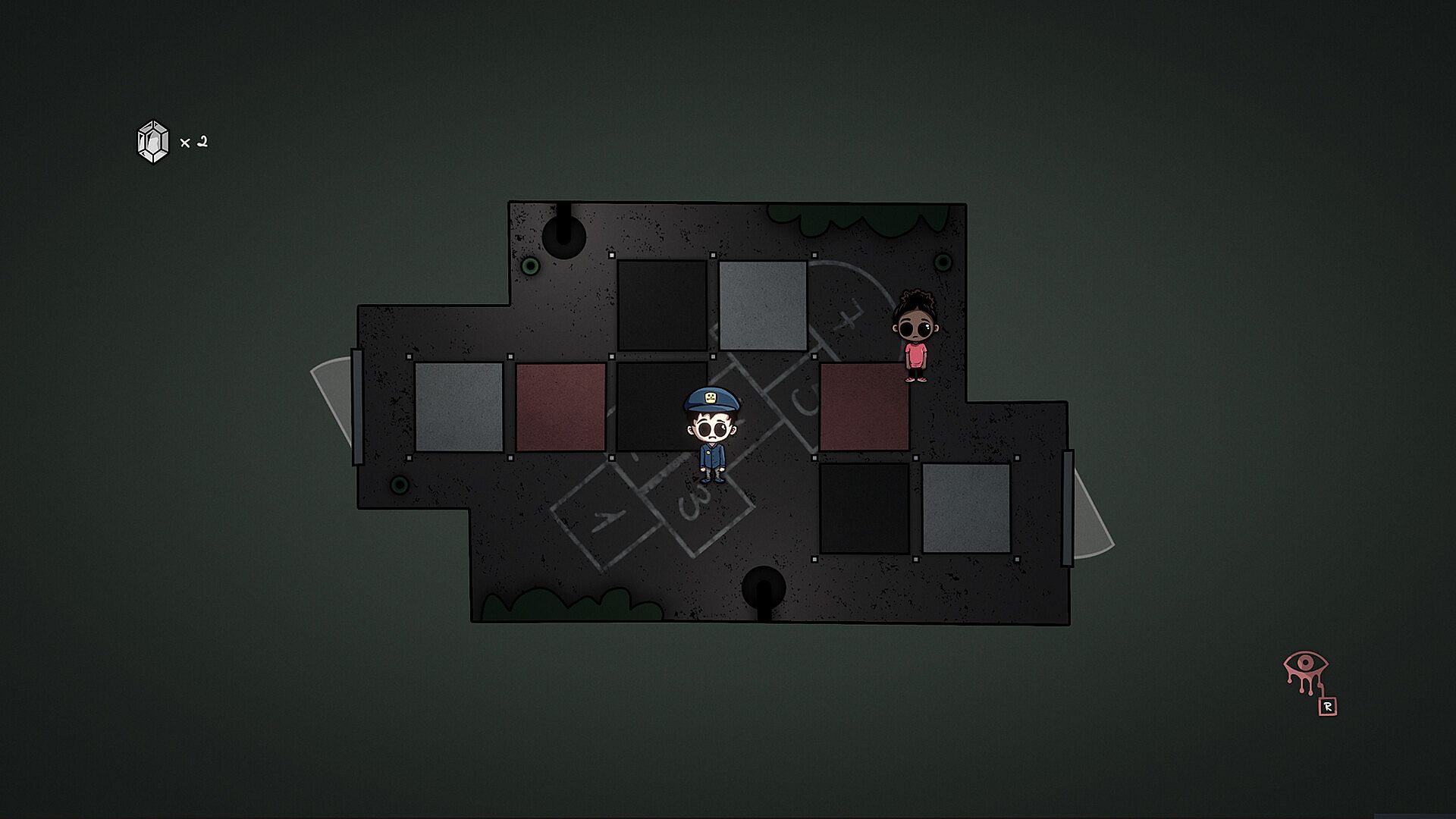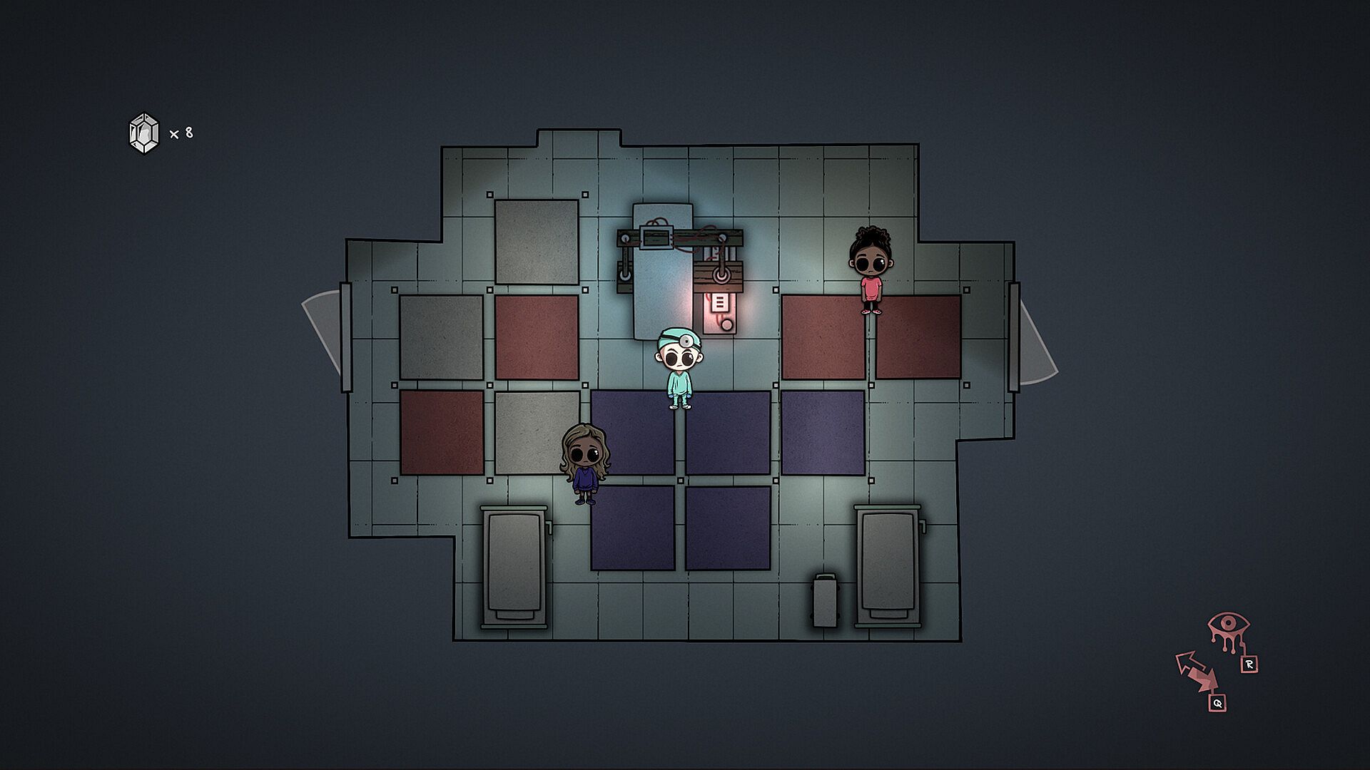 Puzzles are primarily made by color coded tiles. Each character matches a color and can only walk along tiles of that color. Black is impassable to all, while white can be used by anyone. Players use the unique abilities of the characters, to help them navigate the puzzles and master the vast interconnected asylum.