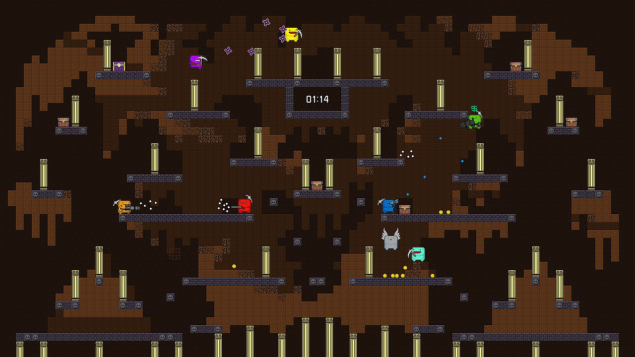 Up to 8 miners dig their way through dirt blocks and other miners face to be the wealthiest gold digger at the end of the match!You have 4 minutes to dig as much gold as you can, breaking dirt blocks with your deadly pike or using the crazy weapons you'll find inside the crates that are randomly teleported through the battlefield.