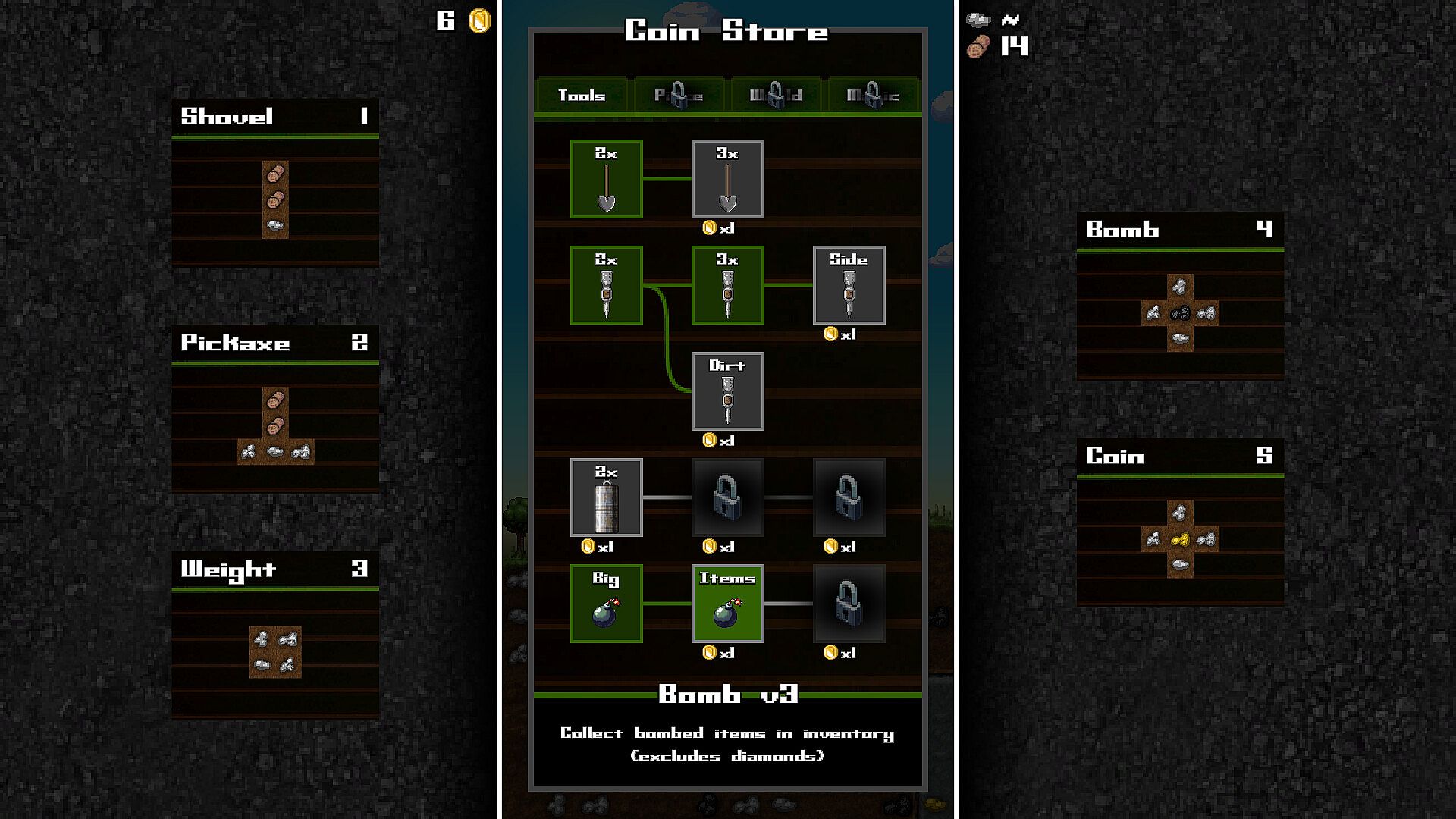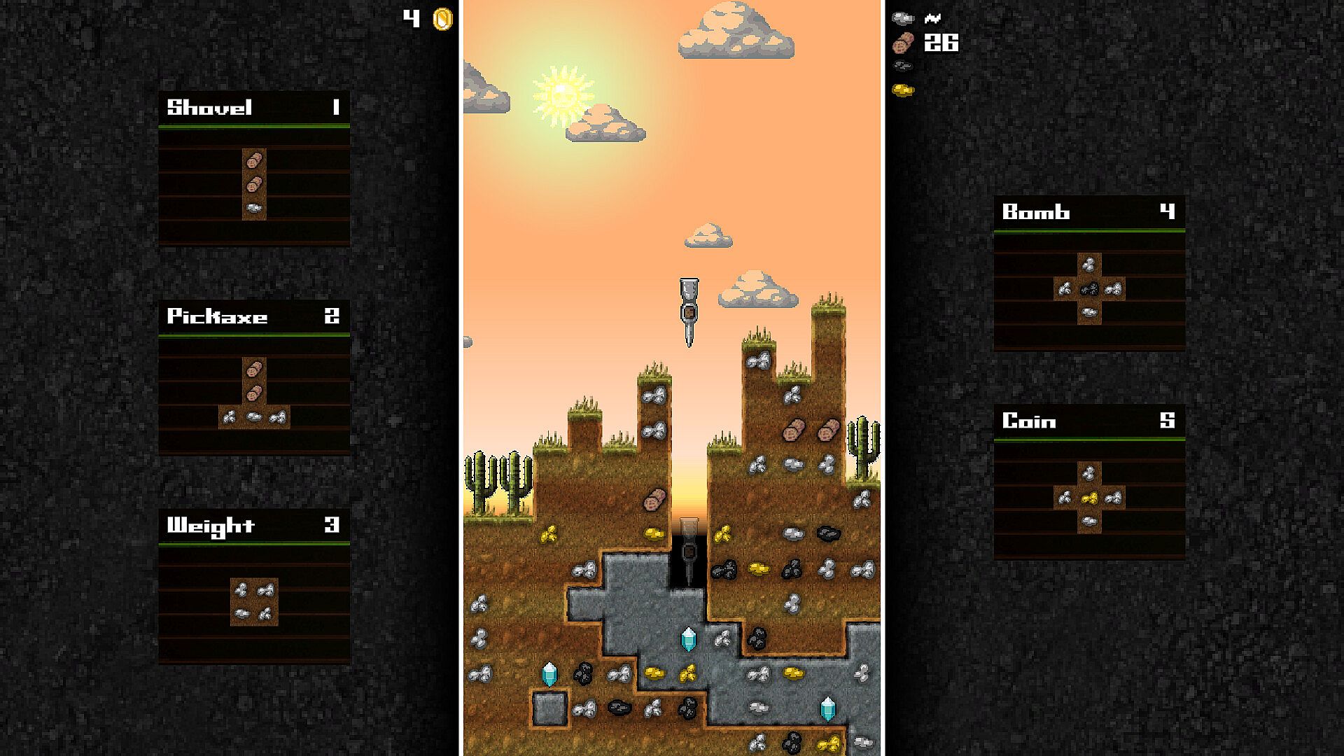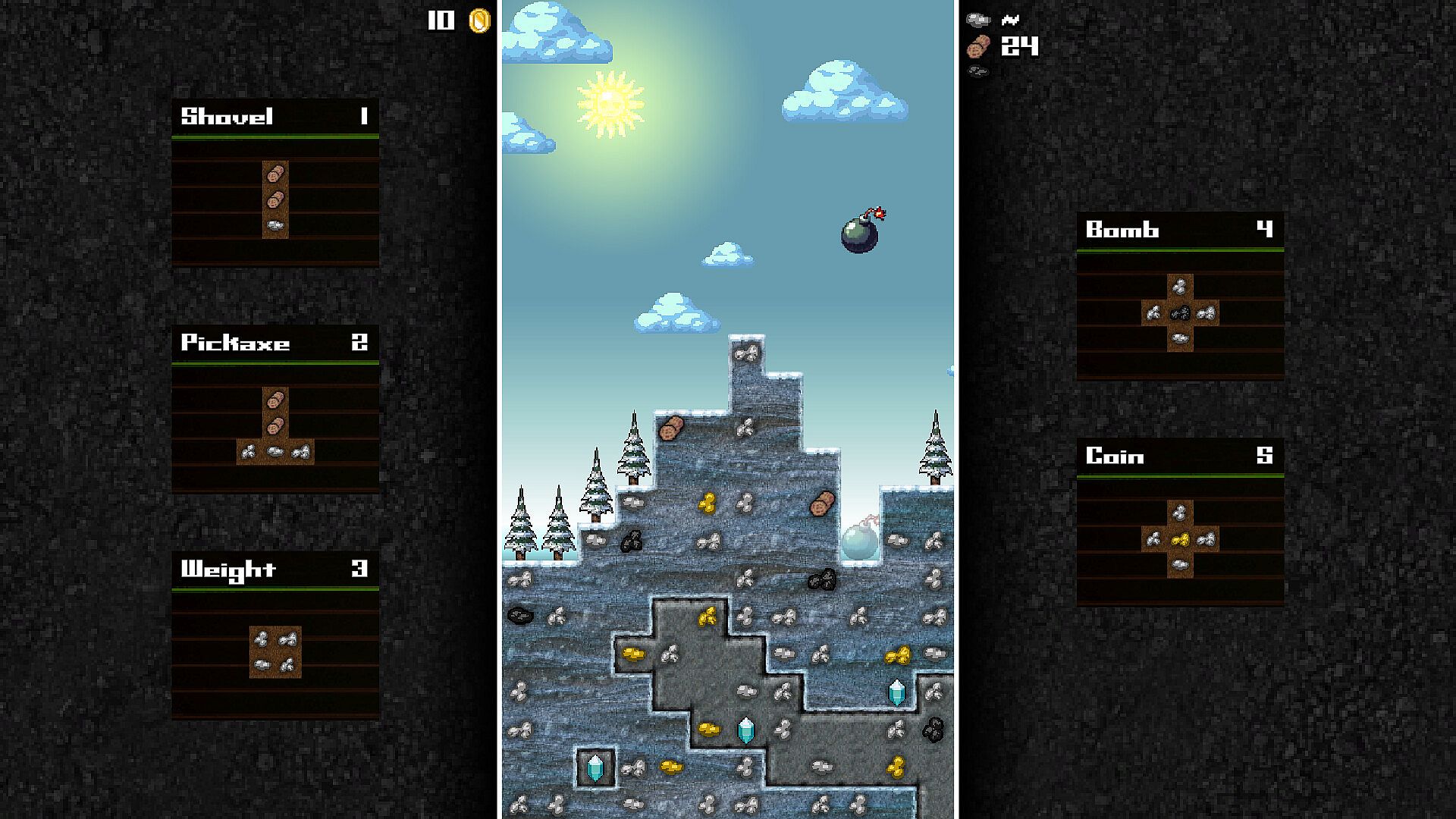 A very tough (but fair!) falling blocks game where you must craft shovels, pickaxes, bombs and other tools to dig your way deeper into the mine and uncover gems to complete your quest! Craft coins to buy upgrades to your tools and special abilities! Quest across a map of different locations where the crafting resources change based on the environment (grasslands, desert, mountains, etc.) Have a friend join for classic PVP puzzle battles, where combos drop trash onto your opponent's playfield!
