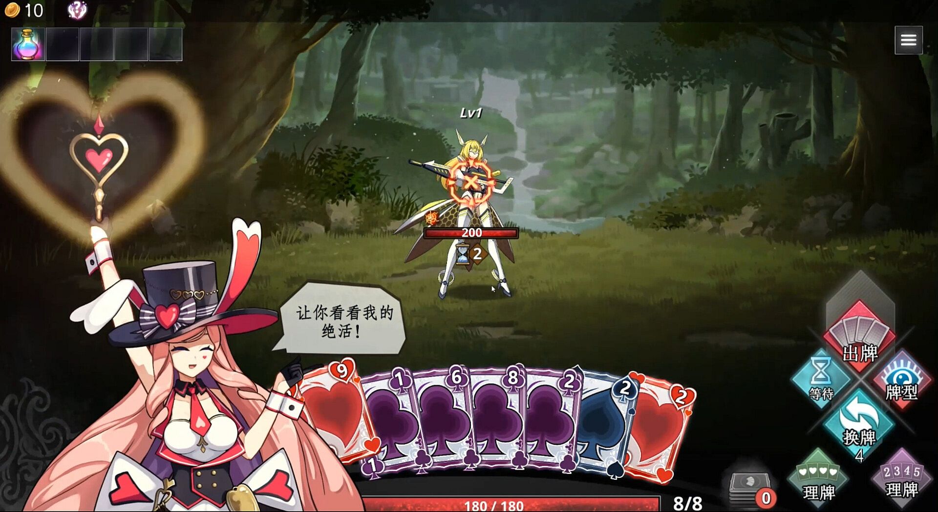 This game's combat system employs a non-traditional turn-based approach, where enemies have a countdown timer. Each time you play a card, the enemy's countdown is reduced by 1. When the enemy's countdown reaches zero, it will launch an attack against you. During combat, you can select up to 5 cards to attack the enemy at a time. The total damage caused by each attack is determined by multiplying the sum of the points on the cards by the card type multiplier and then by the level. Combined with the skill effects attached to each card, making reasonable choices ensures that each attack is unique.