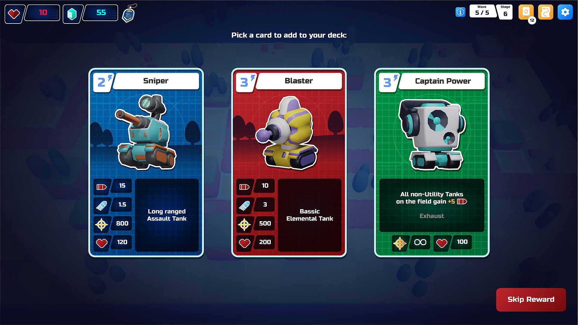 Pick from a roster of unique commanders, each bringing a different playstyle and starting deck to the battlefield. Wanna focus on the pure strength of your tank? Or maybe you want to play tricks on your opponents and focus more on the poison build? No matter what your preferred playstyle is, in Mini Tank Mayhem you will always find your cup of tea.