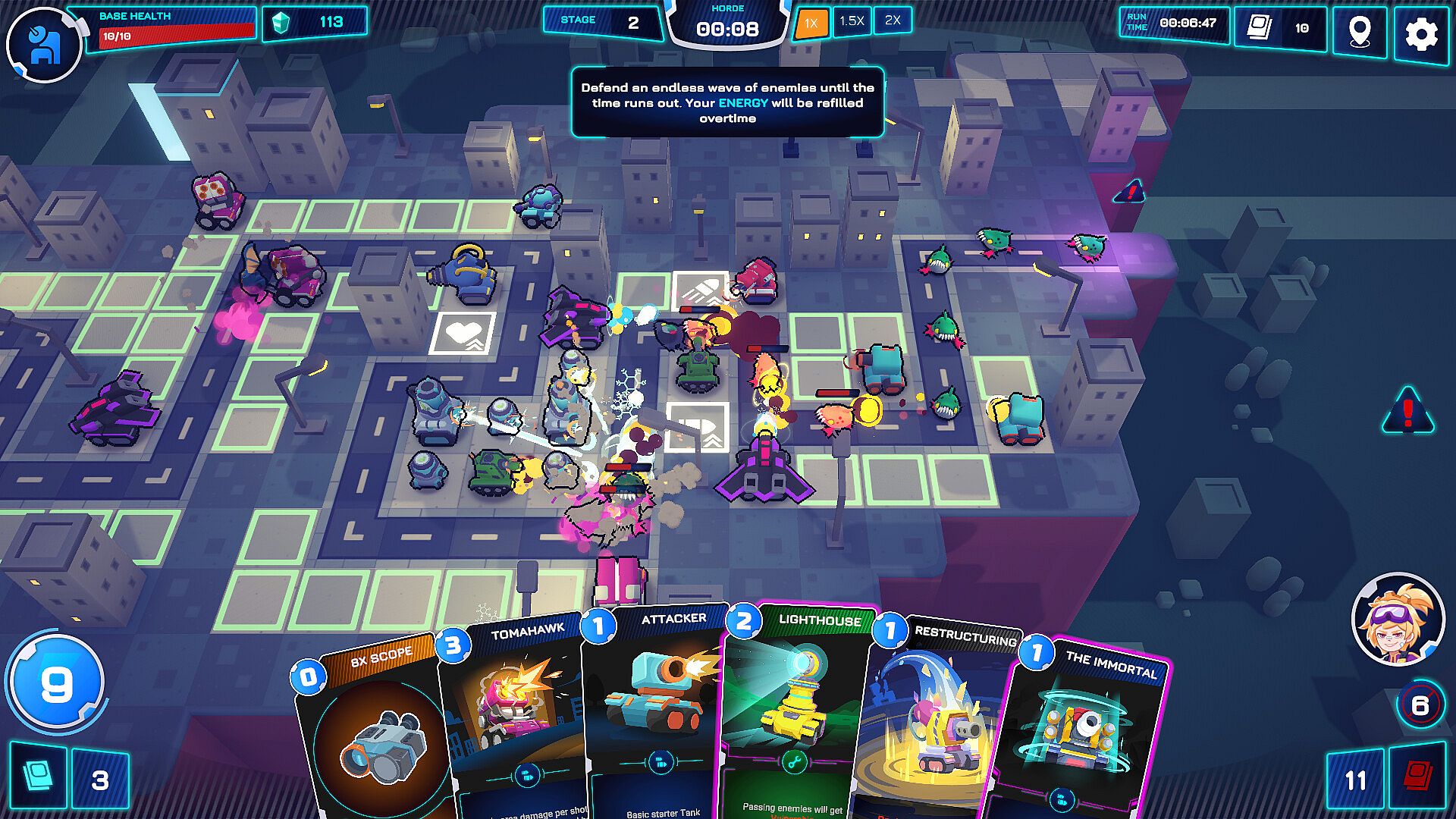 Mini Tank Mayhem offers endless possibilities to break the game or, essentially, survive one more wave. And that is where the true fun and mayhem begin. Combine hundreds of cards and artifacts to create game-breaking power to eventually obliterate your enemies.
