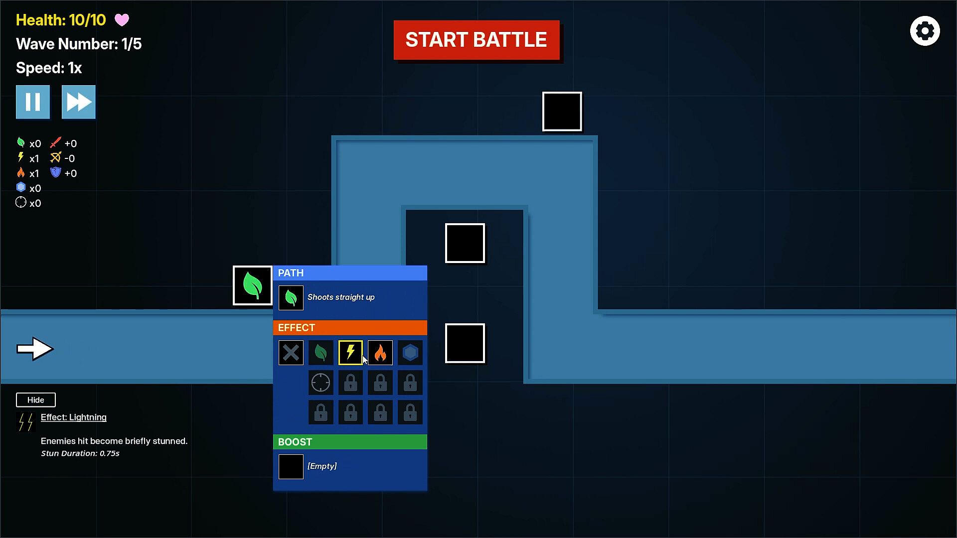 Equip elements to different slots to customize your tower's damage, effects, attack speed, range, and more.