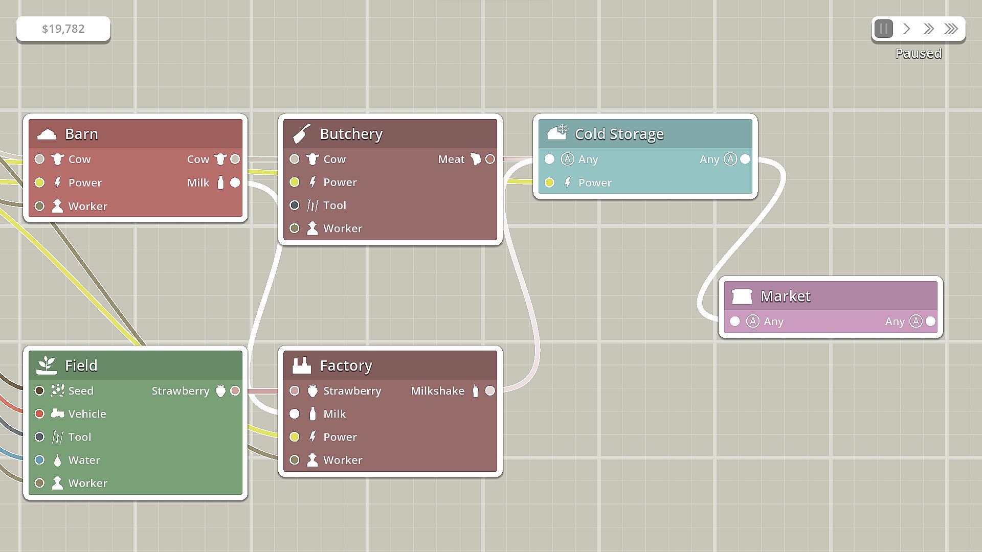 • Build factories to produce your own goods using resources from the market or your own farm.