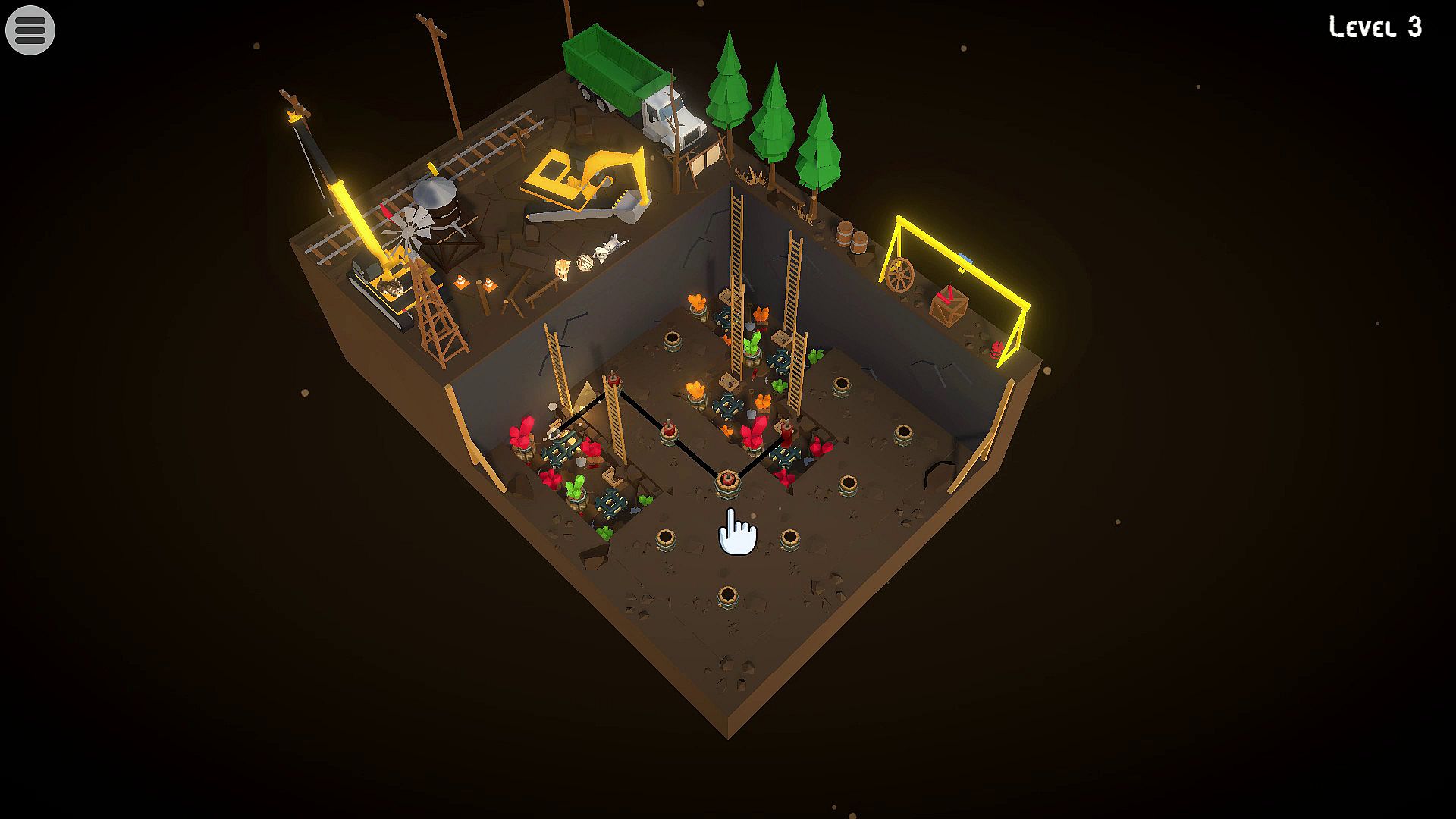 Each level has a grid of squares with colored gems occupying some of the squares. The objective is to connect gem mines of the same color by drawing 'gunpowder trail' between them such that when it explodes, the entire grid is occupied by railway tracks. However, railway tracks may not intersect. Difficulty is primarily determined by the size of the grid, ranging from 4x4 to 7x7 squares.