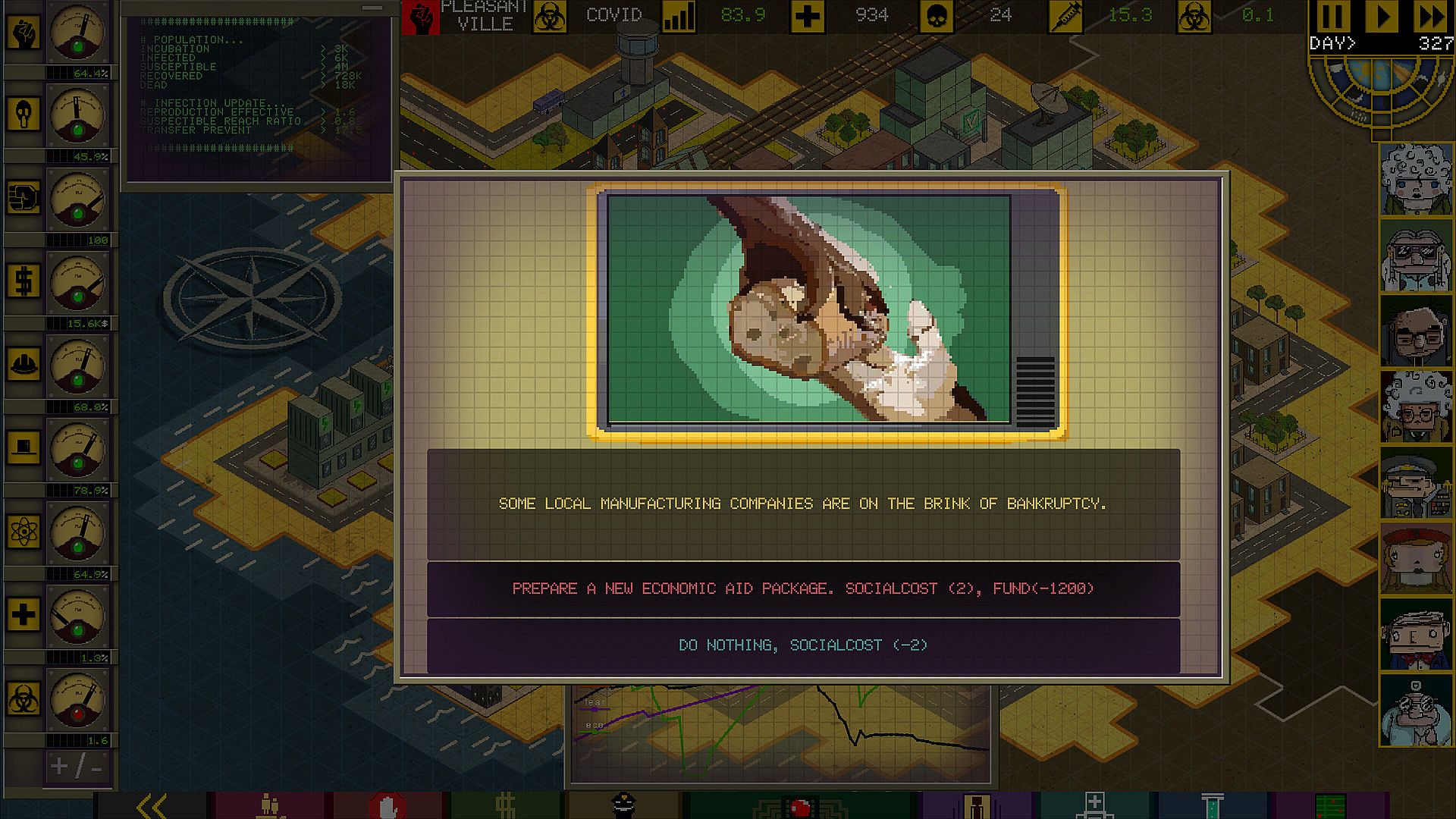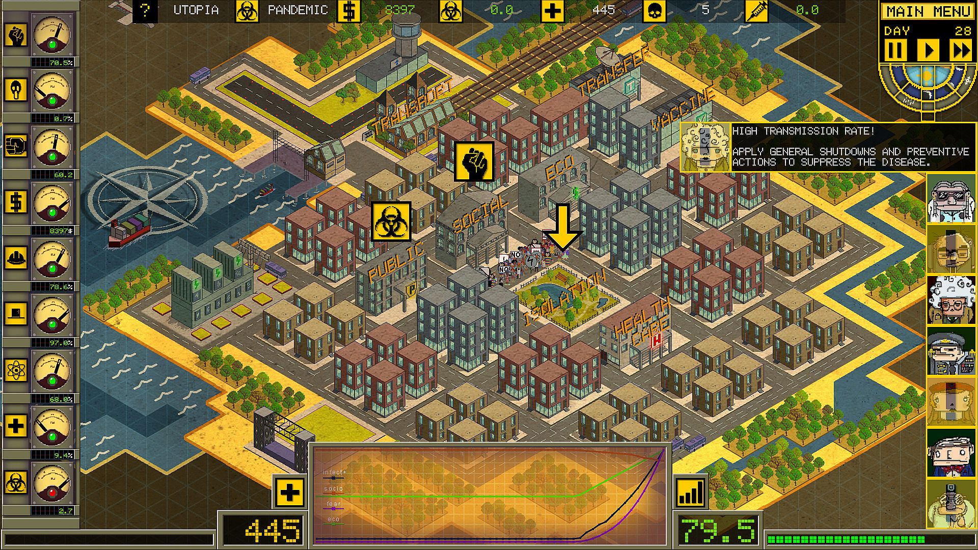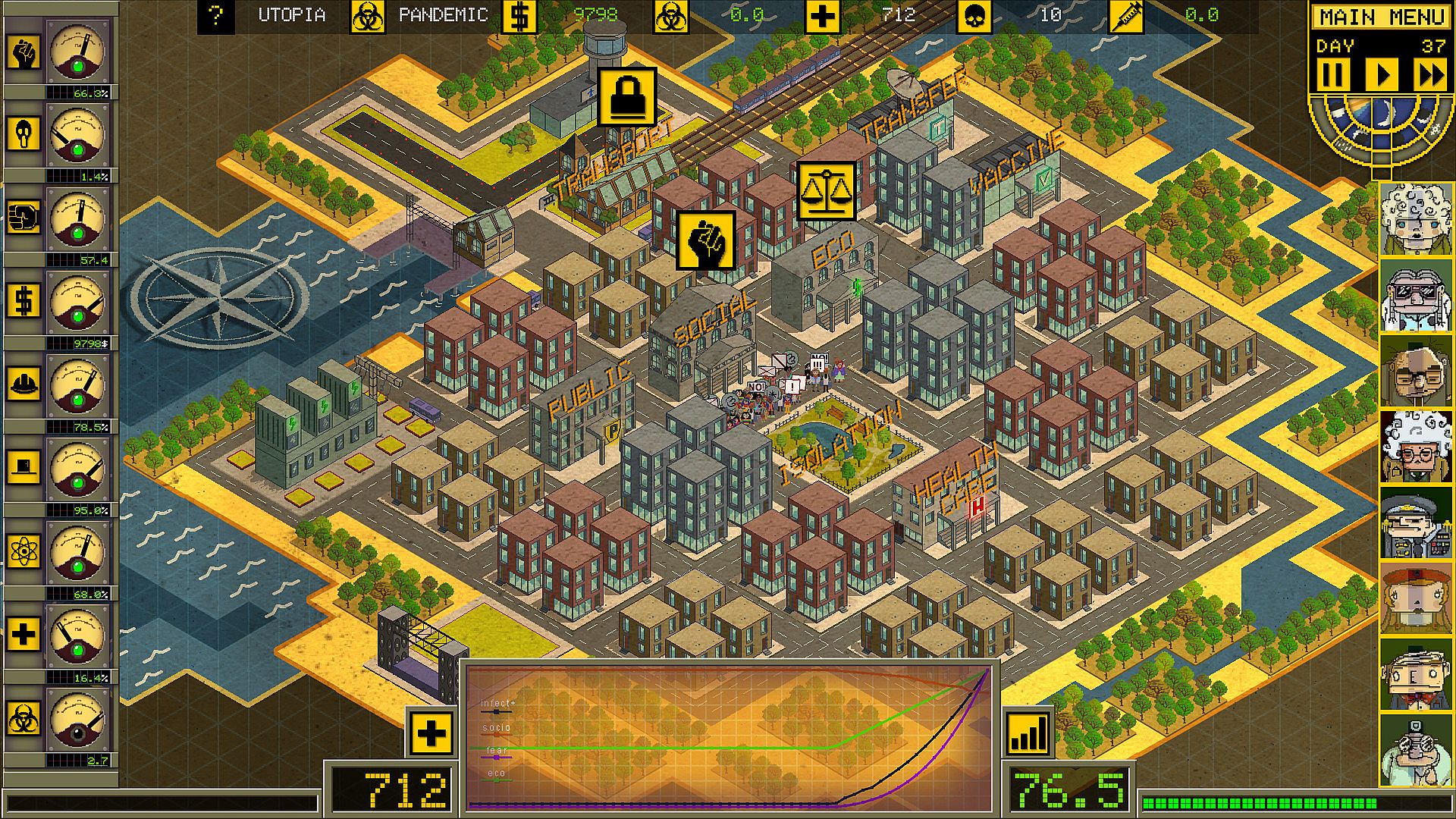 - Choose a counselor during pandemic control; seven different consultants represent different aspects of pandemic control. Each of them comes with bonuses in their specialty. Even the same scenario with another advisor will be a different game experience.
