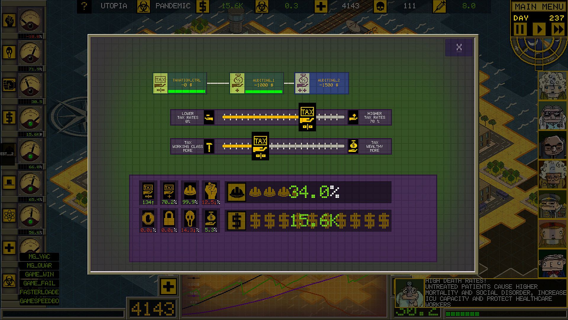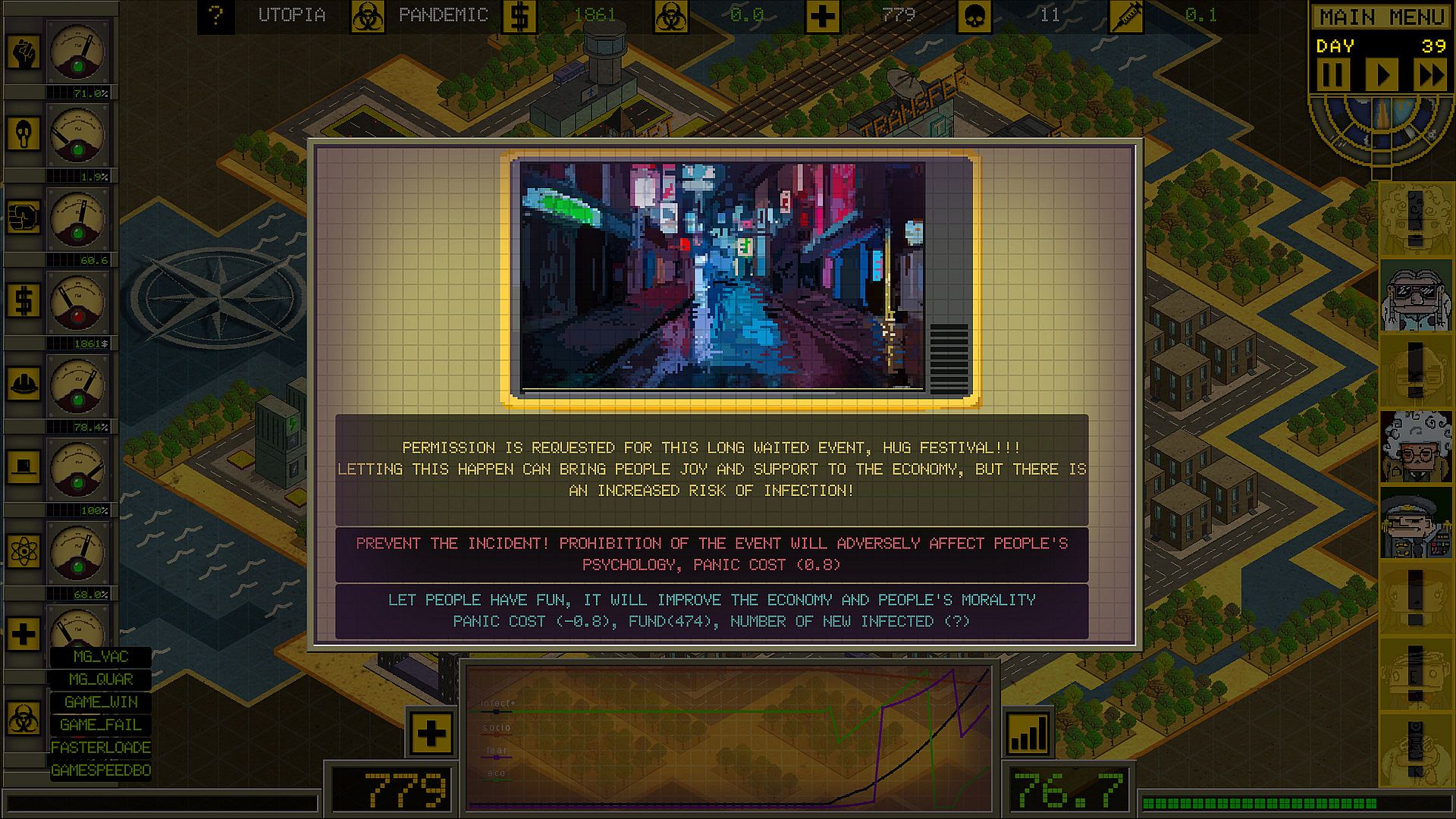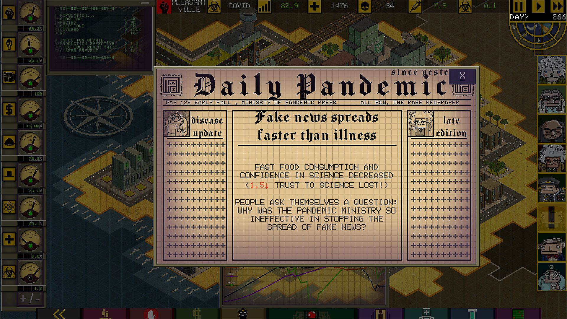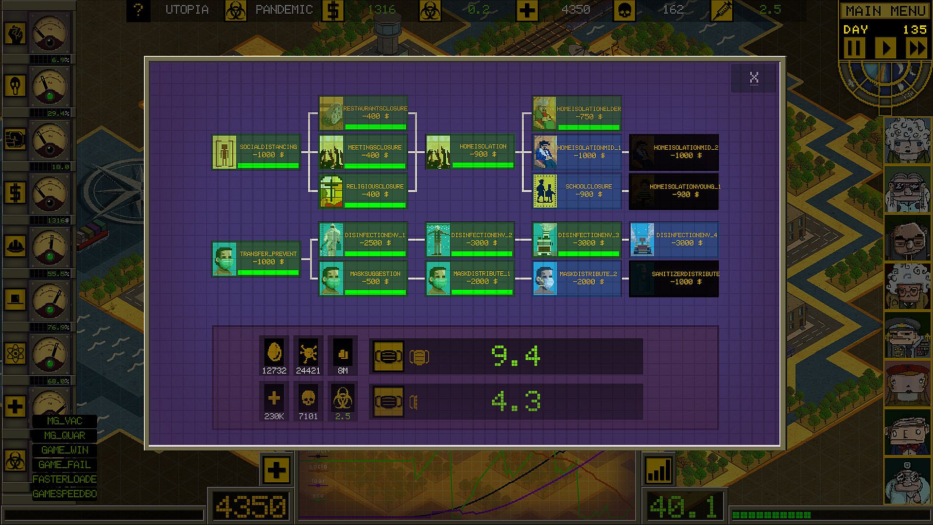 - Choose a counselor during pandemic control; seven different consultants represent different aspects of pandemic control. Each of them comes with bonuses in their specialty. Even the same scenario with another advisor will be a different game experience.
