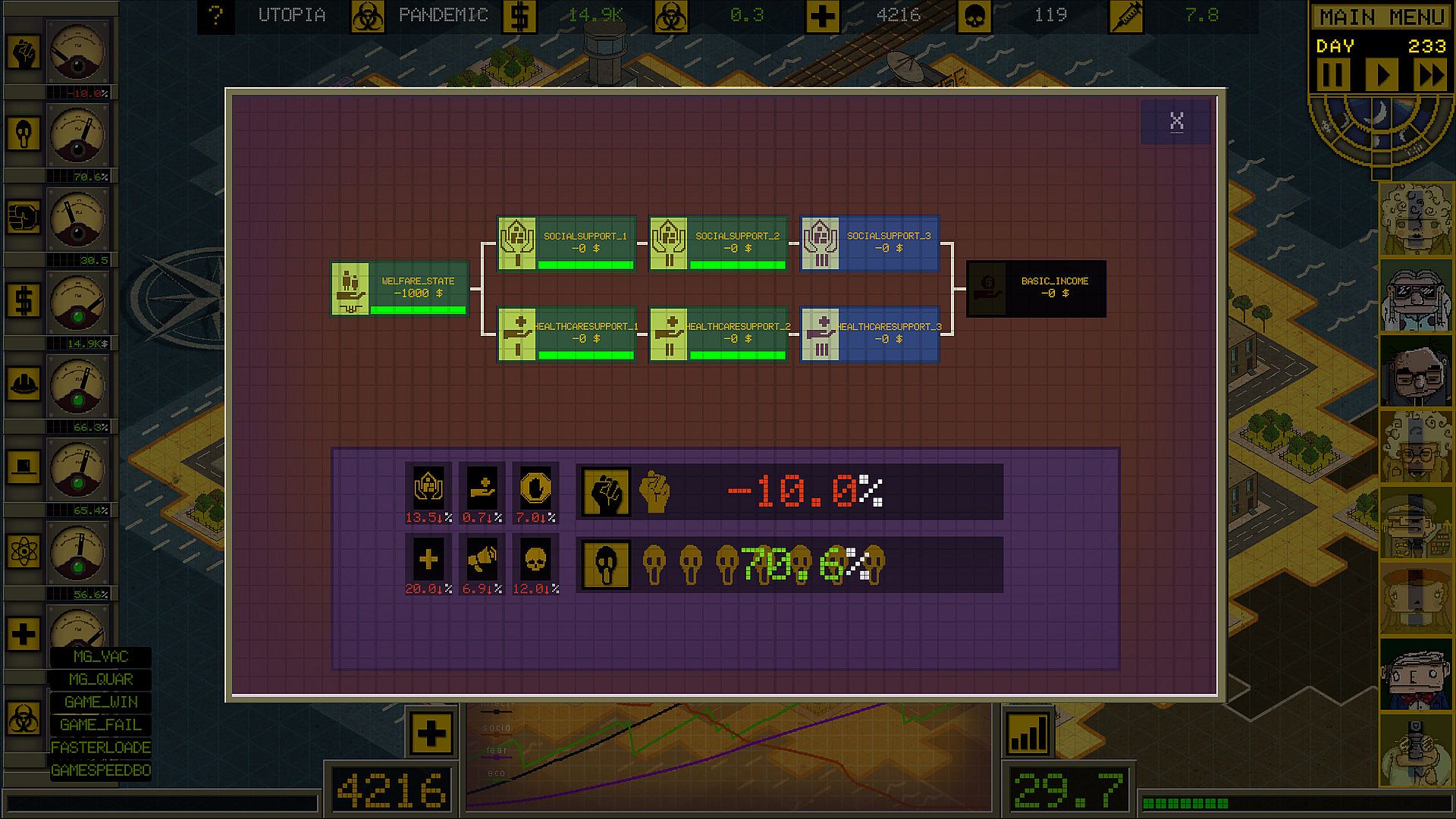 - Interconnected technology tree and dependencies for all actions. Most activities can be activated and deactivated according to the needs of the community and disease control.