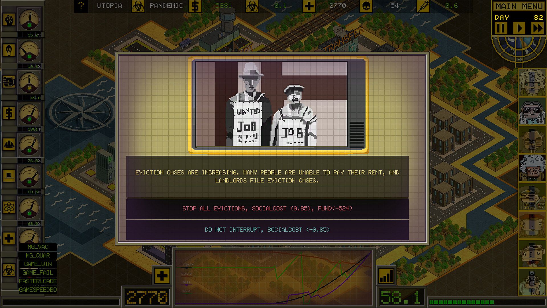 Continuous social discontent will result in civil unrest and protests. While some demonstrations just show society’s current issues, others will not disappear unless the player takes action and fix the problems.