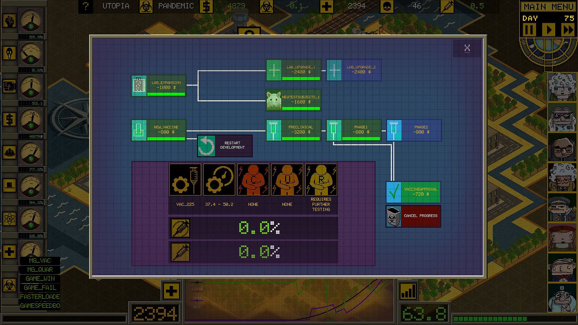 Develop and test candidate vaccines. From the discovery phase of the vaccine to the final stages of development, players will have more information such as effectiveness and side effects. While it's possible to get a vaccine approved early, it may come with surprises!