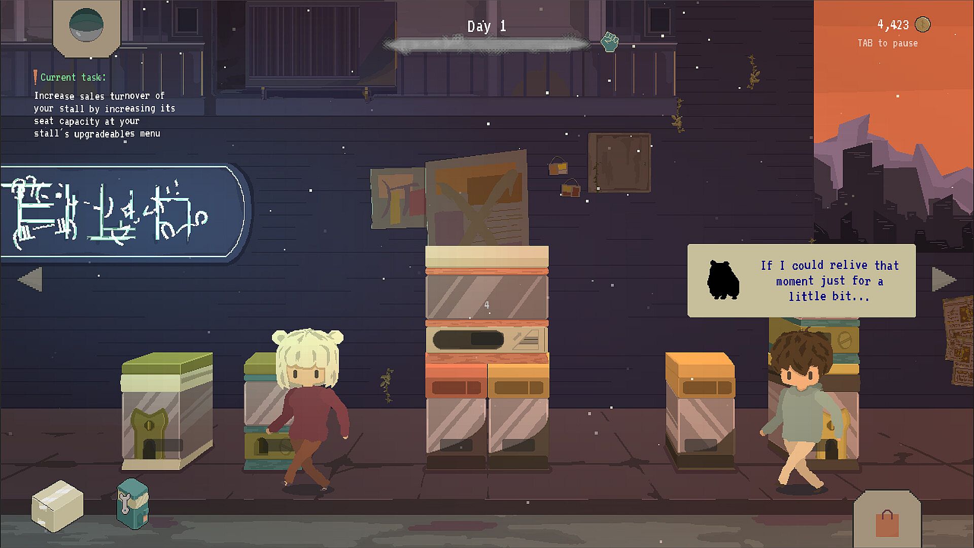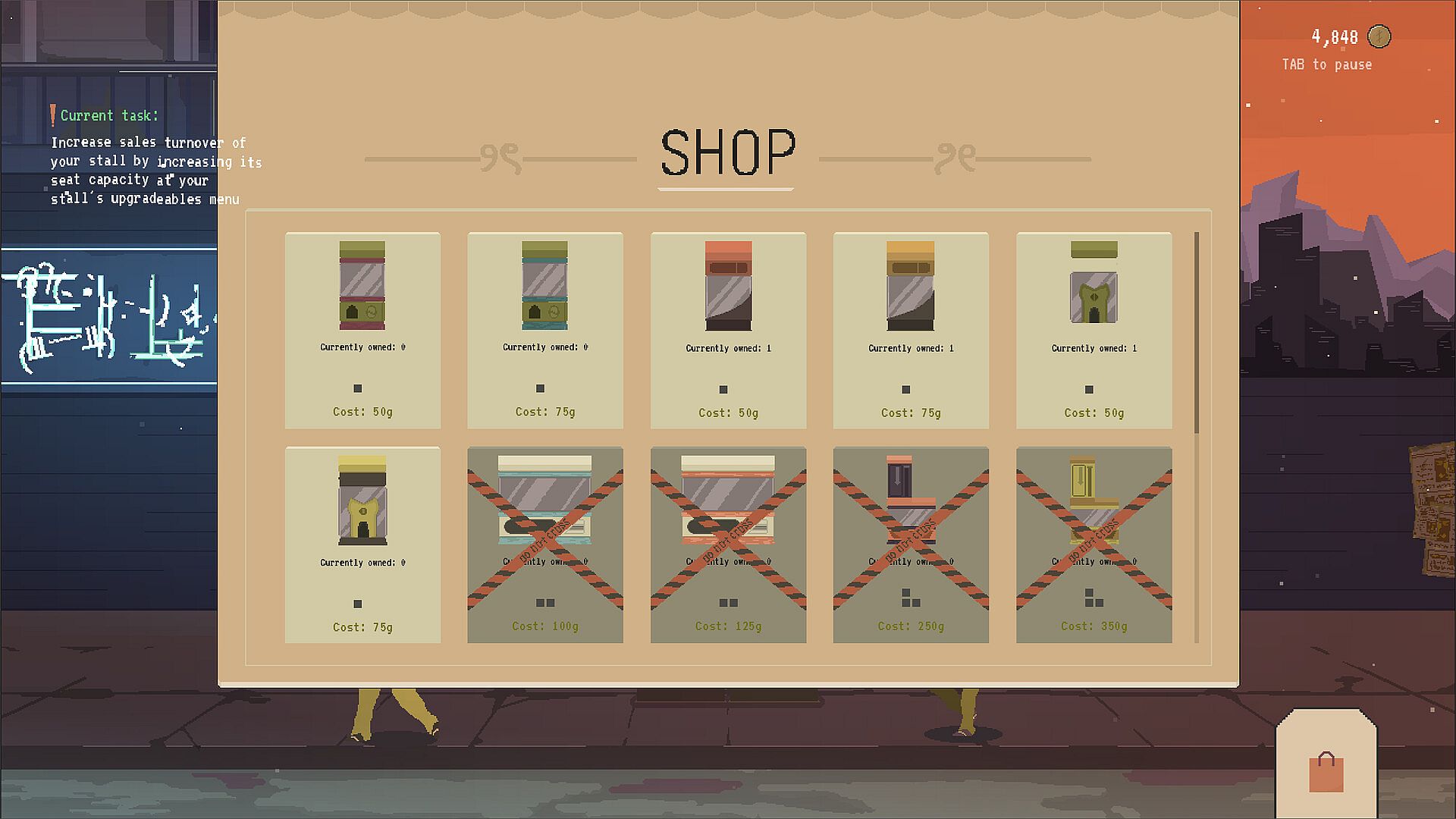 A short, chill game about managing a ramen stall-front to distribute contraband 'cute-ware' to the masses in rebellion against a nation-wide strict anti-aesthetic policy.