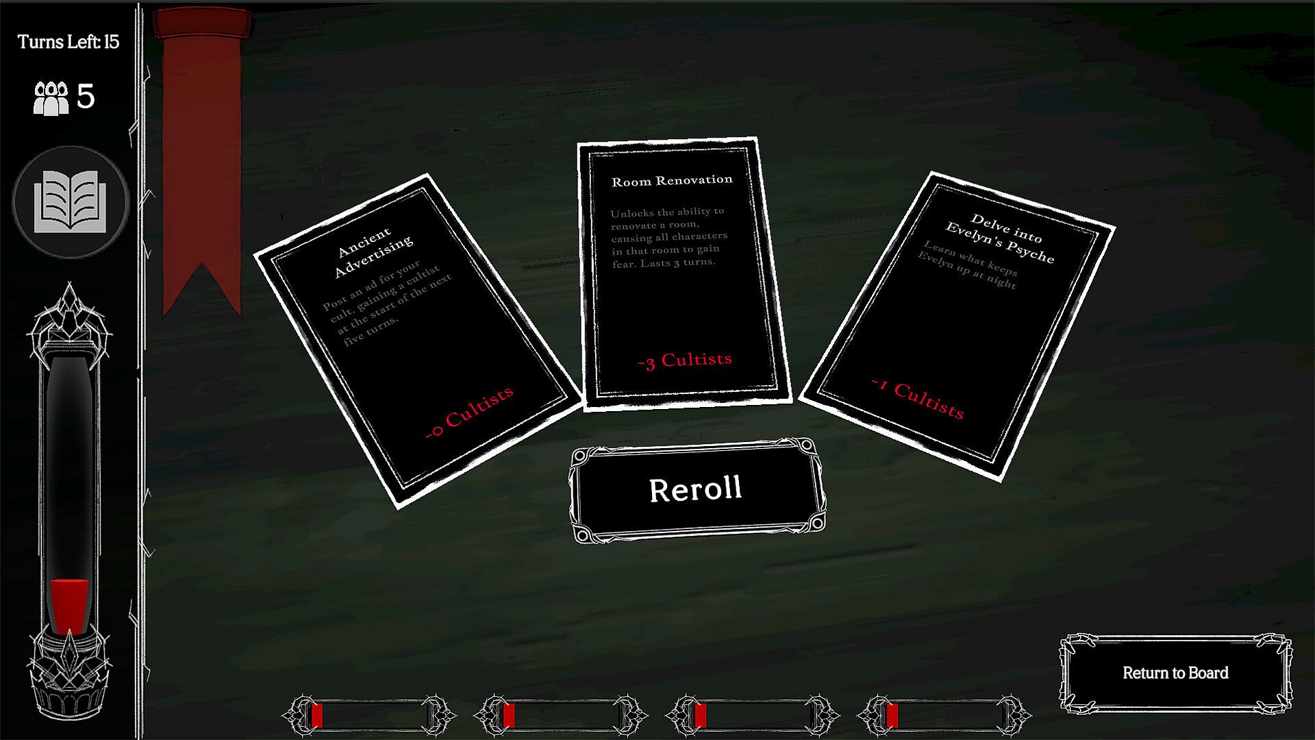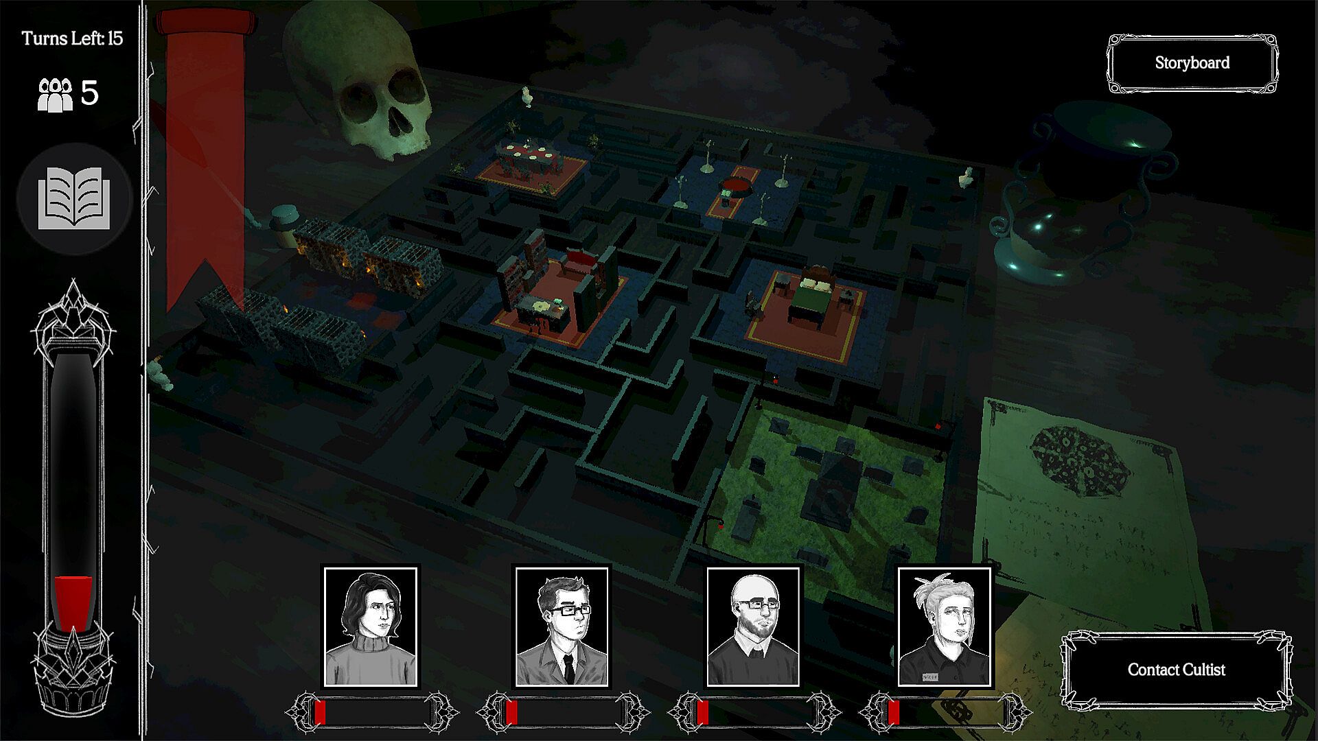 Each turn, you will engage in dialogue with your victims psyches where every choice matters. Depending on their outcome, the humans will start to behave differently. Then, you can use their cultists to manipulate the labyrinth and prevent the humans from escaping. Balance influence and information against the clock in order to summon into the human realm and reign with fear.