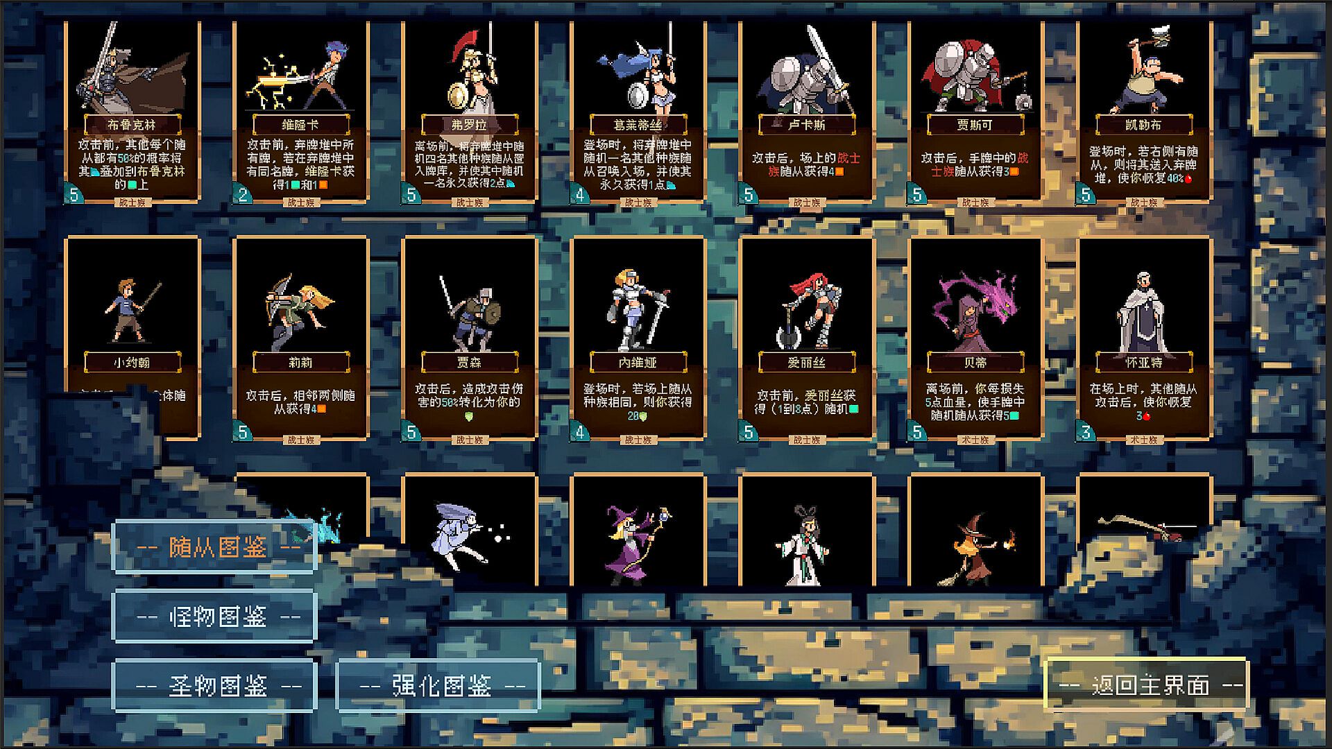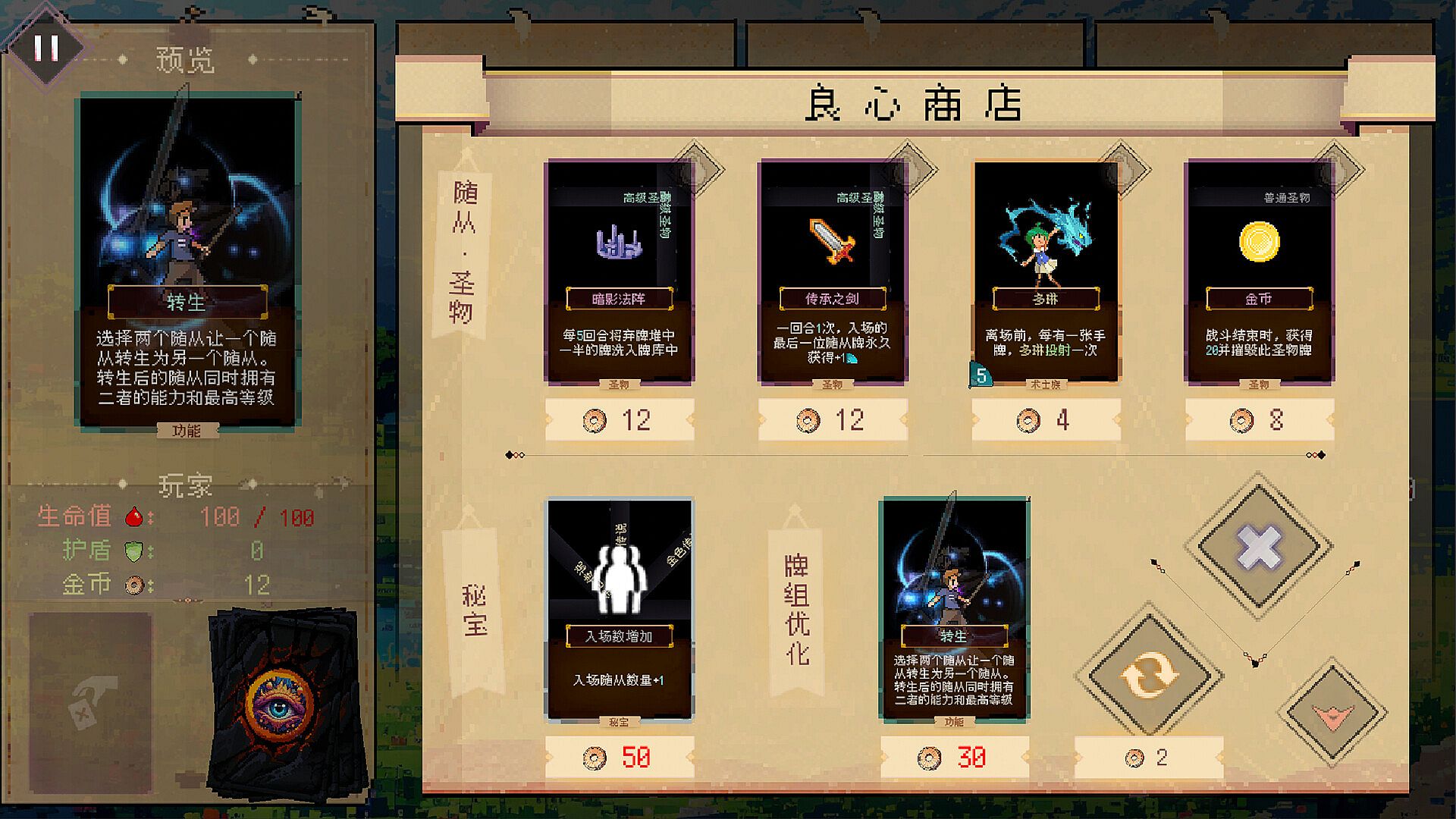 1. The game contains a variety of card types, the main types are divided into: follower cards, relict cards, enhancement cards, enemy cards, players by building a deck of cards composed of follower cards, and with the help of limited relic, to fight against different enemy cards. After hitting an enemy, players can buy cards in the shop to replenish or improve their deck.