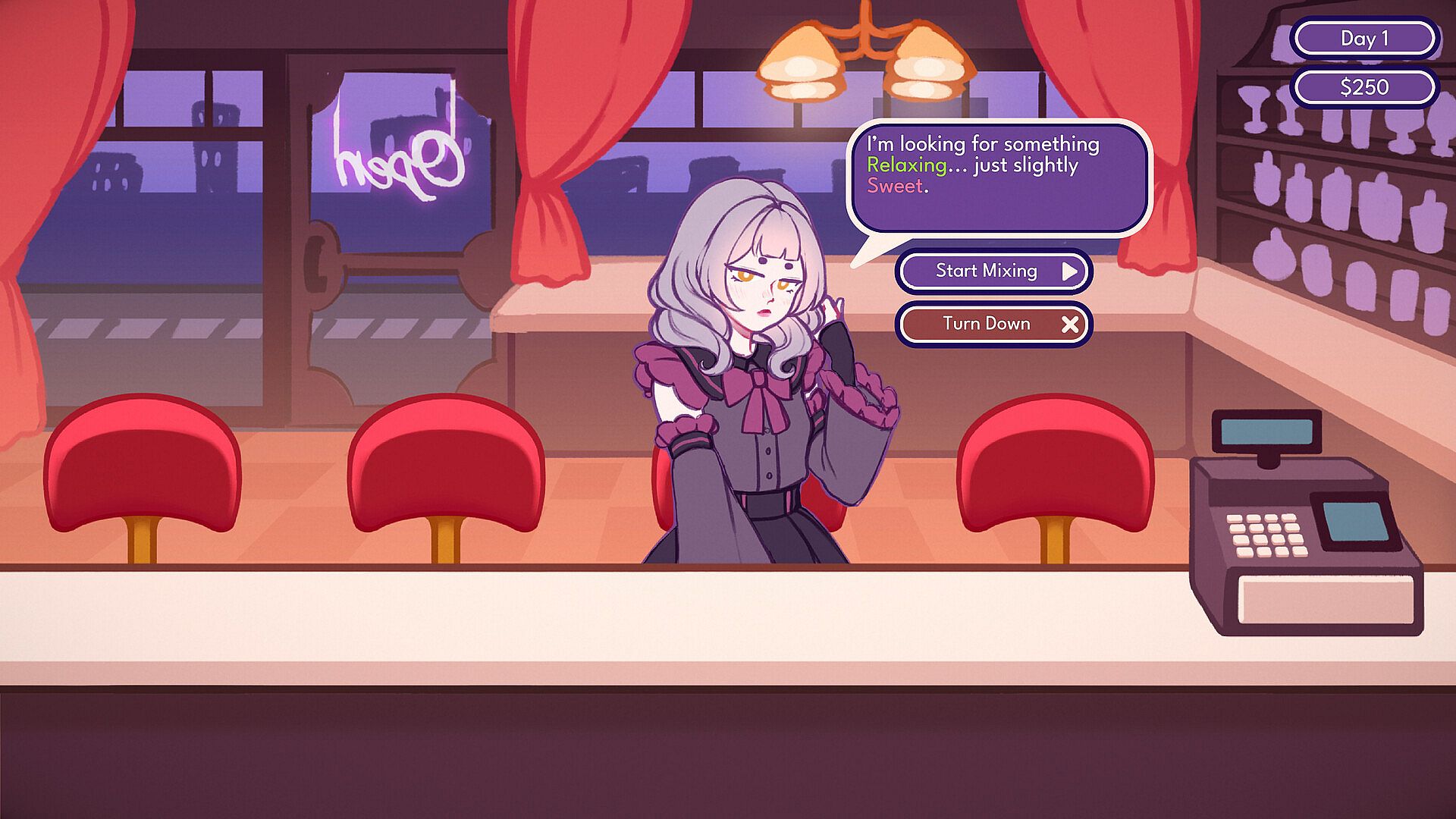 Create original drinks by combining different ingredients with attributes like Sweet, Bitter, Spicy, or Relaxing. The better you match the customer’s desires, the bigger your tip!