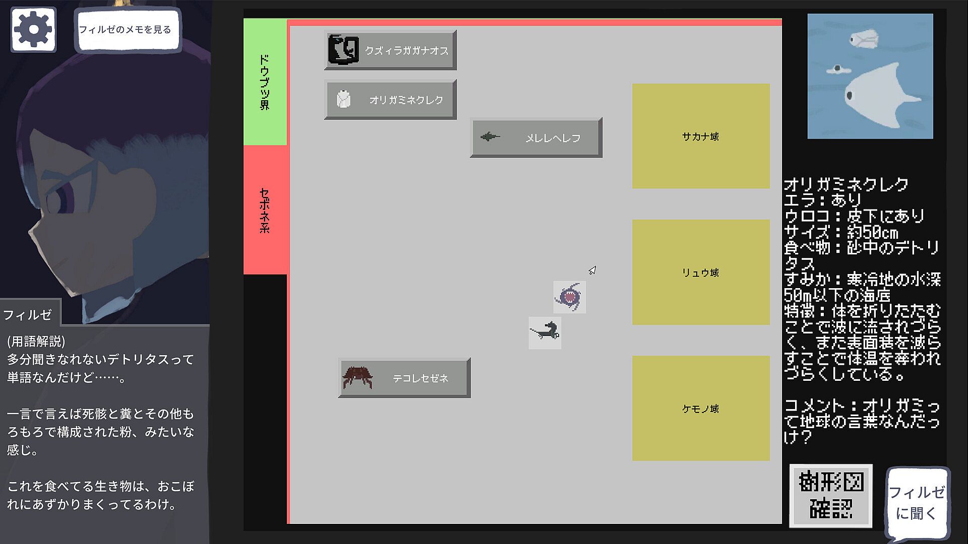 ――本作のジャンルは、「生物分類恋愛ADV」。 生物学者の「フィルゼ」と交流しながら、主人公「私」は生物の生態を元に推察、分類で樹形図を作る作業を行っていきます。