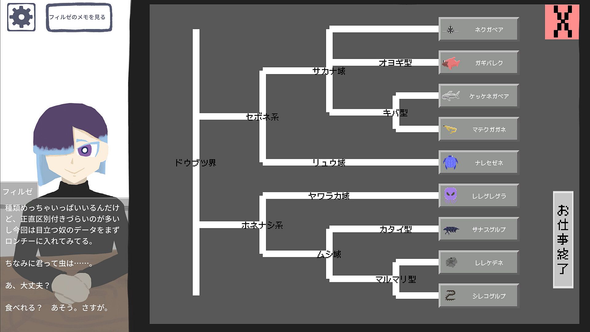 生き物のパネルを動かしてフォルダに配置し、推察しパズルのように樹形図を作り上げましょう! そして、その間でフィルゼと会話しながら仲を深めていきます。選択肢や作業によって分岐する不思議なラブストーリーをお楽しみください。
