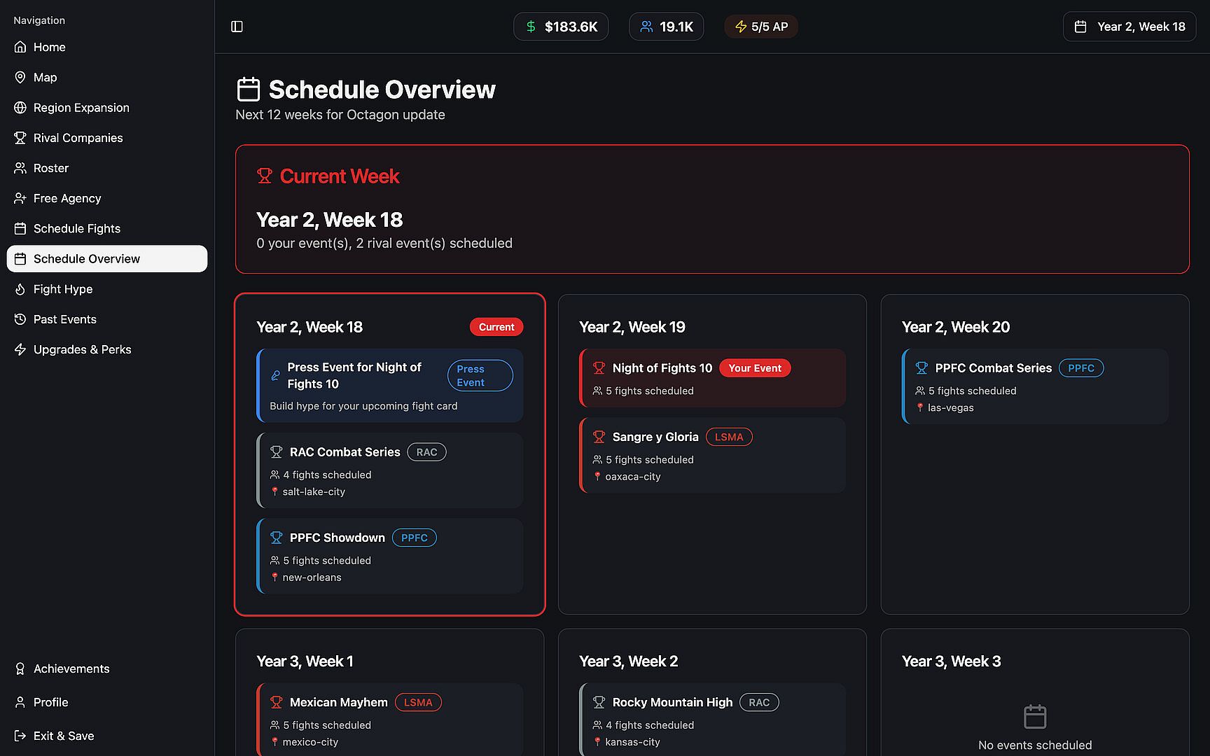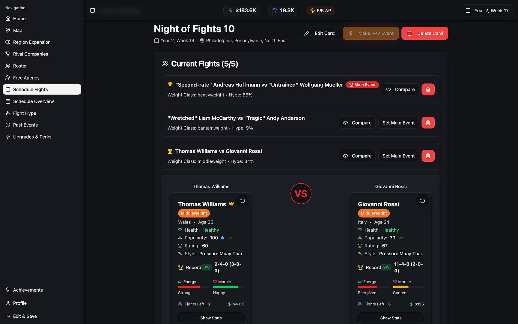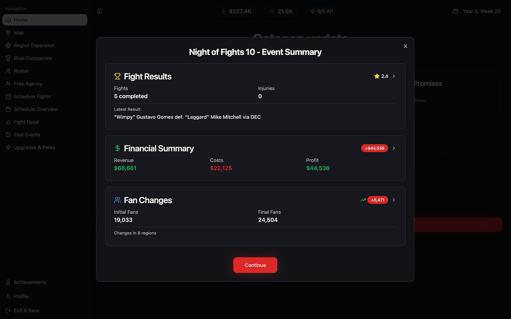 MMA Empire takes you into the shoes of an owner, founding his MMA Company. Choose a background and a starting city, and build your MMA Empire! Manage your roster, book fights, expand your territory, and take down established MMA companies! This game is in its early stages, with more updates with new features planned to come soon. Create Your Legacy!