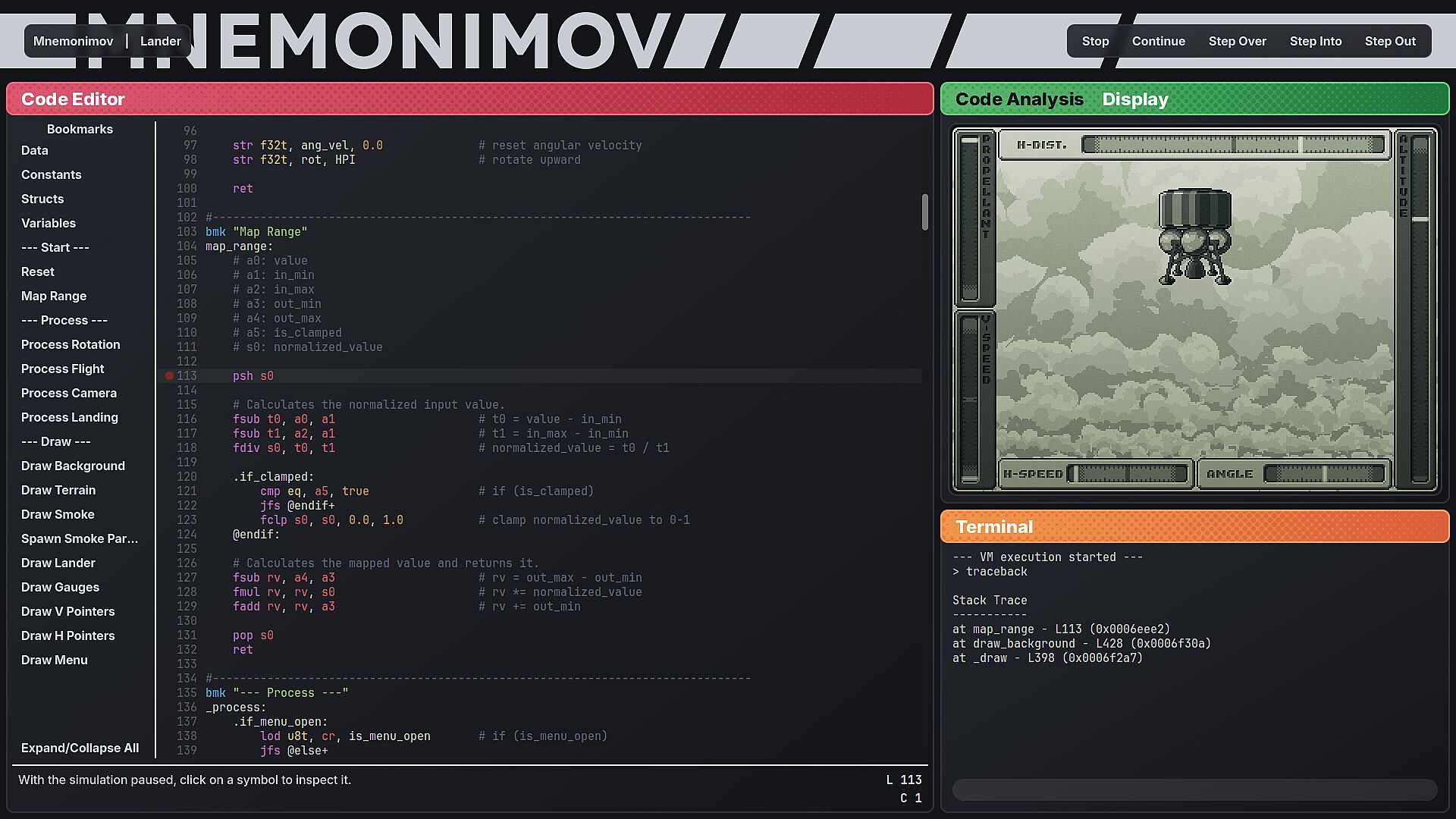 Mnemonimov (pronounced as ne-mo-ni-move) is a programming sandbox that recreates the experience of developing games for early consoles. Instead of writing high-level code and rendering colorful graphics, you'll be working with low-level concepts, writing instructions in assembly and rendering to a monochrome screen.