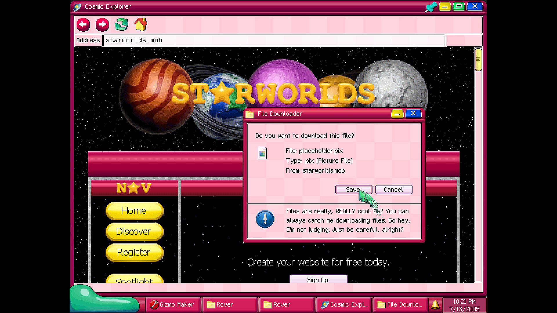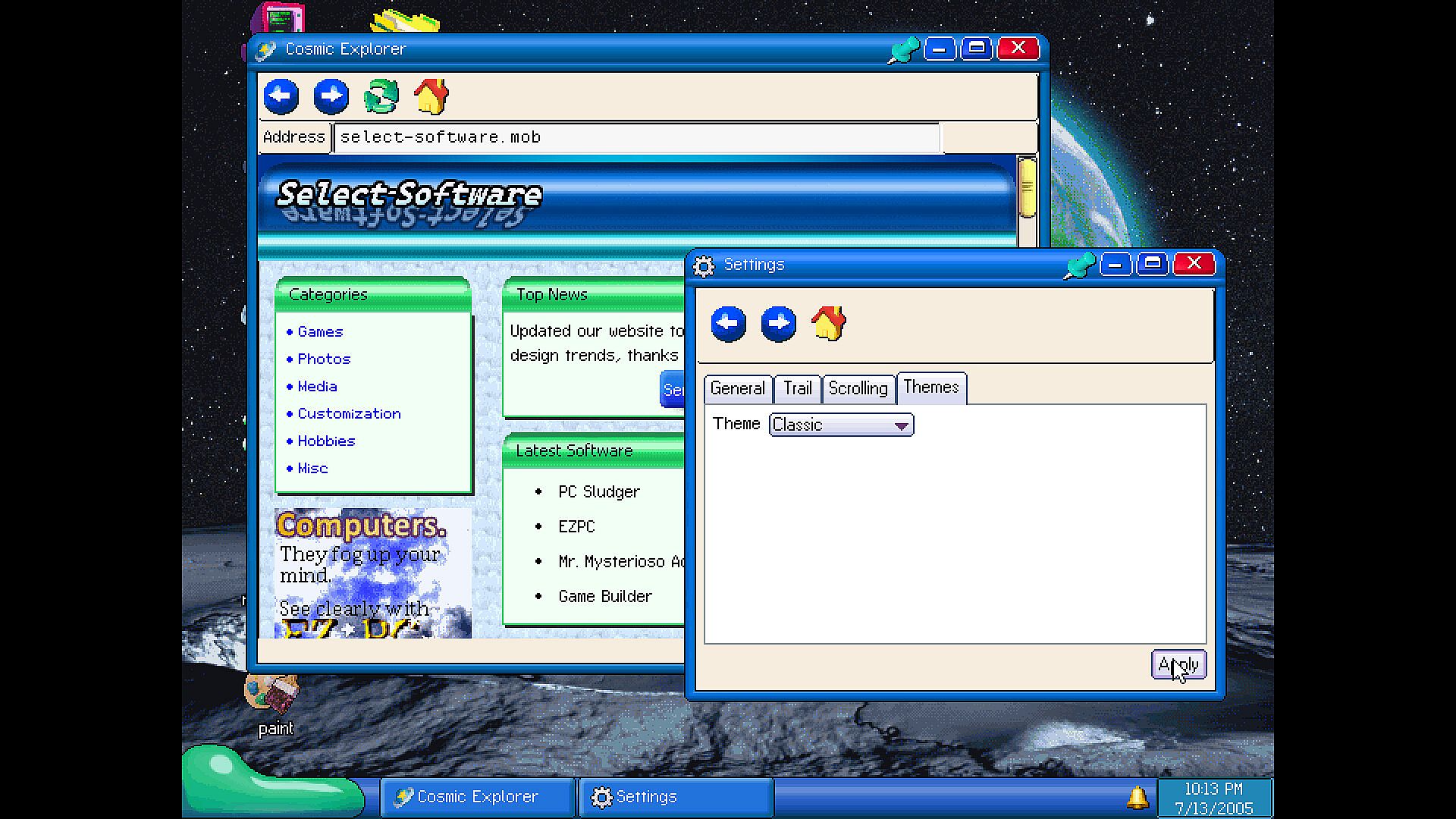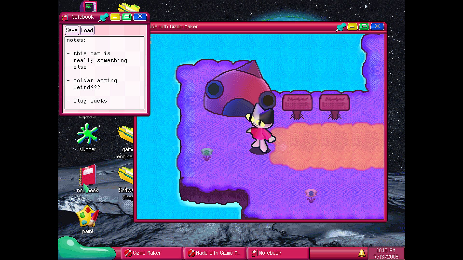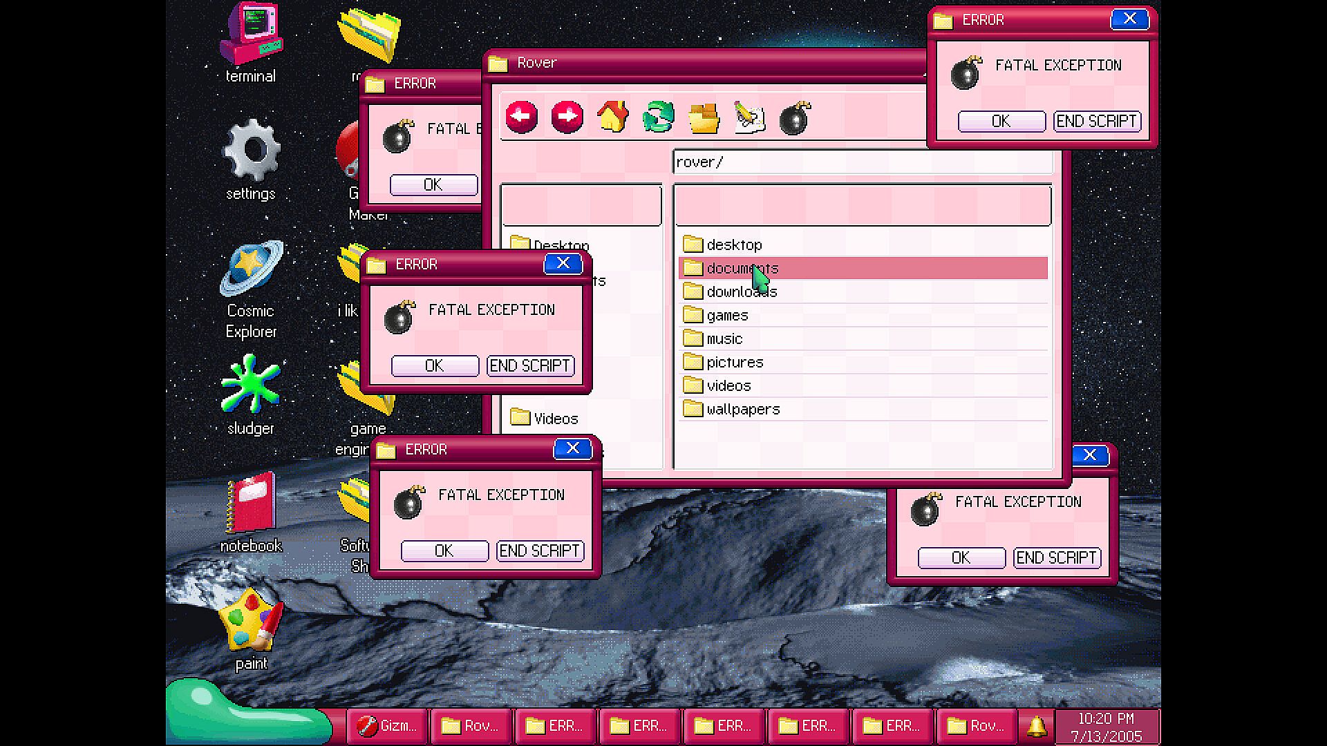 mobOS is a nonlinear operating system and internet exploration game set in 2005. Once you start playing, the clock in game is tied to your actual computer's time and date, updating in game pages, forums, software, updates, and more throughout real life time depending on how you interact with them.