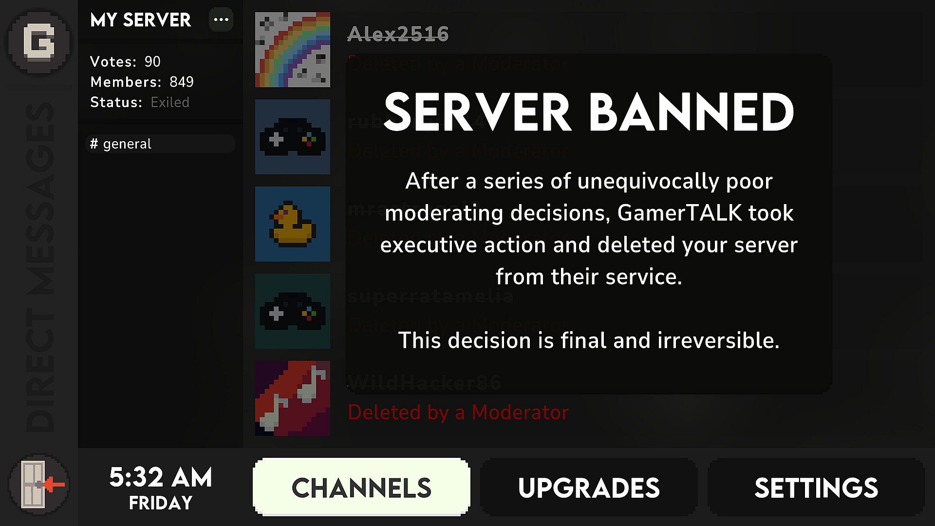 In Moderator Simulator 2, you'll take the role of a "GamerTALK" server owner as you punish rule-breakers, unlock new features, and become the greatest moderator of all time!
