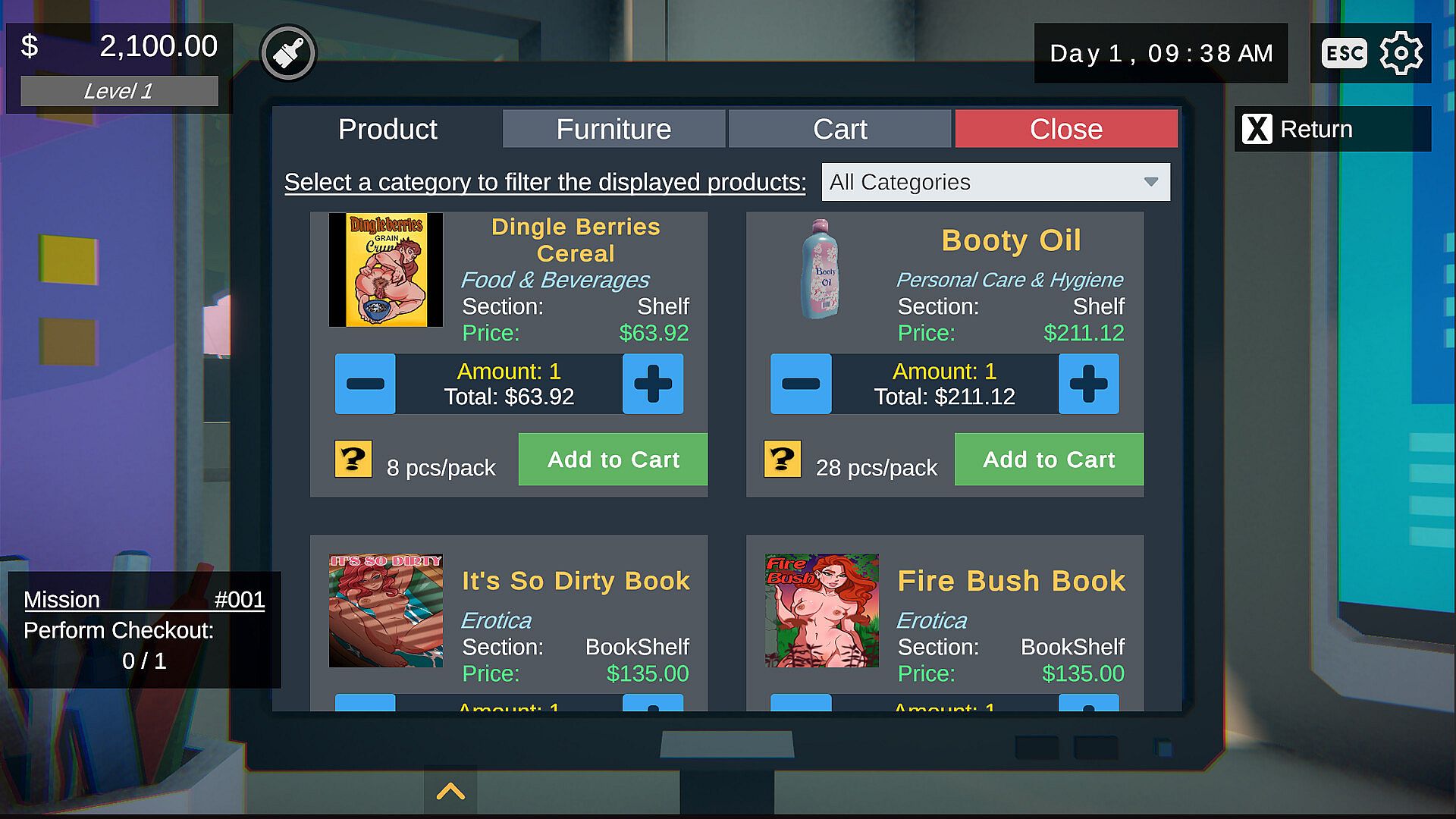 Manage Your Stock: Browse a catalog full of adult parody products, from movies and erotic books to novelty toys and décor. Keep your shelves stocked to keep the customers coming back.