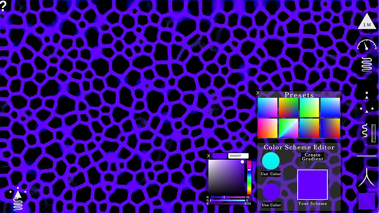 Control the traits of millions of pixel spores in this slime mold simulation. Adjust speed, trail length, and other properties to shape their behavior. A tutorial guides you through the setup, while a color menu lets you pick background schemes from presets to match your vision. Preview spores before running the simulation and tweak every parameter for total control. Watch as they form lifelike structures through your experiments. Simulation fans who enjoy precise property adjustments and visual pattern creation will find endless ways to play.